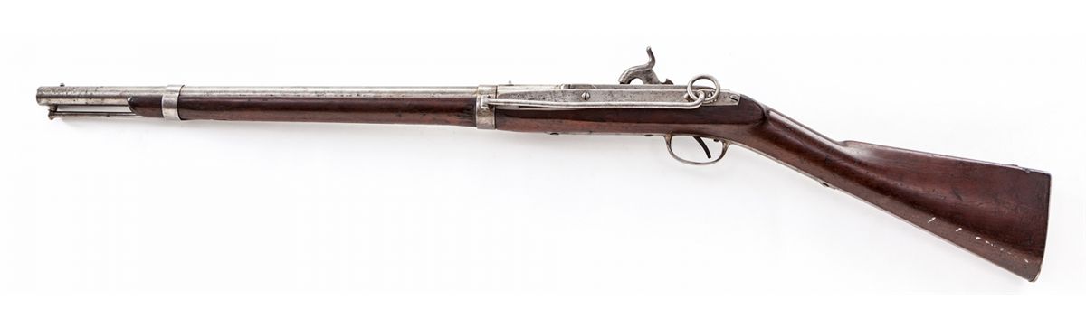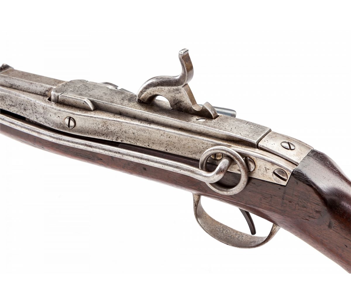 Model 1843 Hall-North U.S. Rifled Breechloading Percussion Carbine, dated 1849, .52 cal., 21'' round brown lacquered barrel, case hardened breechblock and hammer, ''JA'' inspector's mark to right side behind rear sight and cartouched to walnut stock. Ramrod is present. Late production with the word ''Steel'' stamped behind rear sight. Condition is very good retaining little original finish, with most of the metal having gone bright. Breech lever retains approx. 92% original blue. Stock is unsanded with scuffs and oil darkening. Action is crisp, bore is very good to fine. Est.: $1,800-$2,400. (Antique)