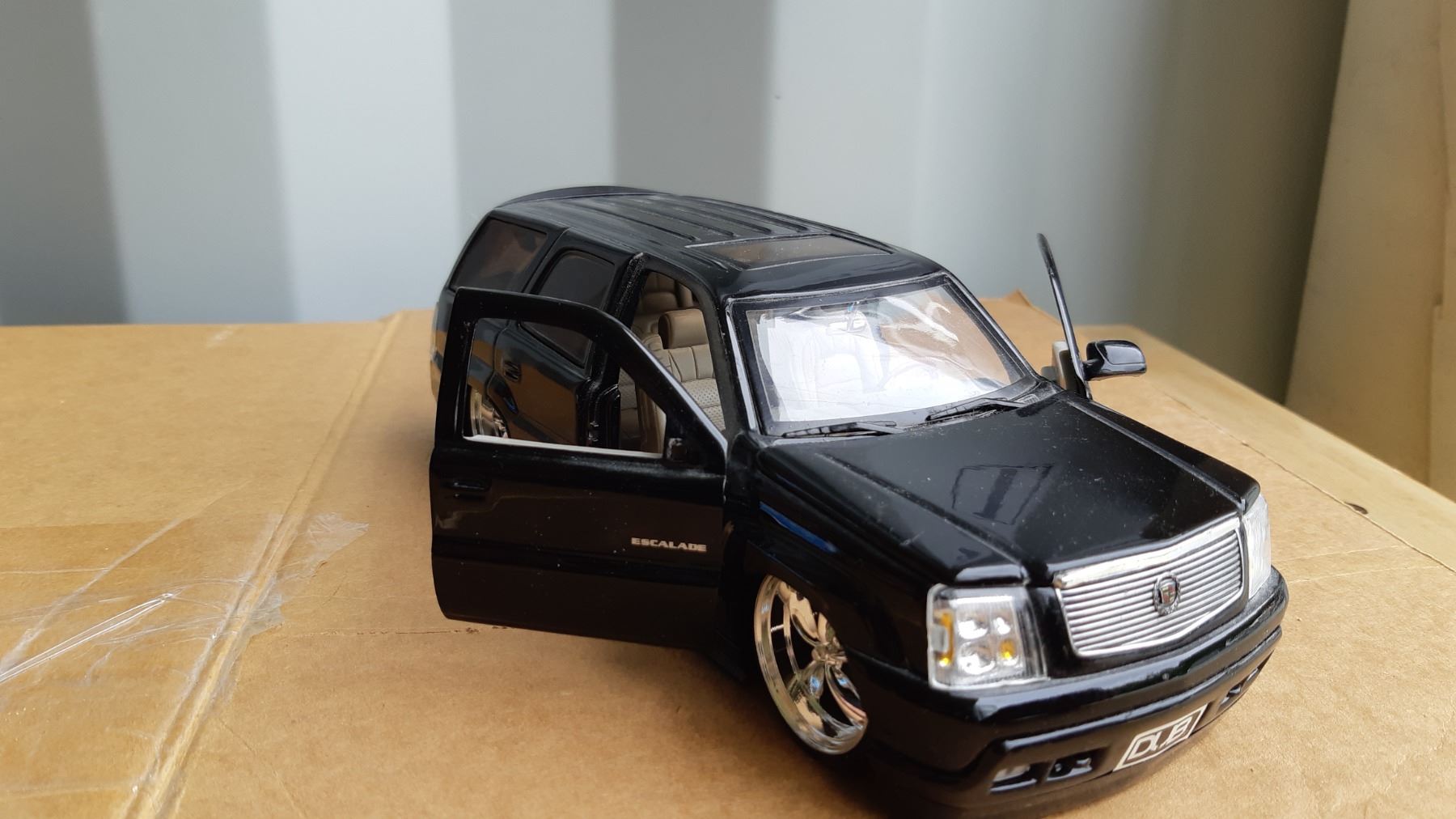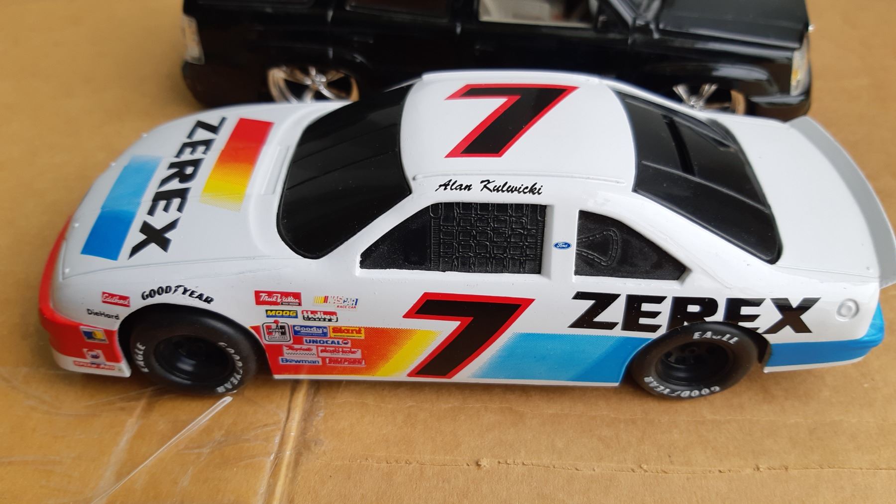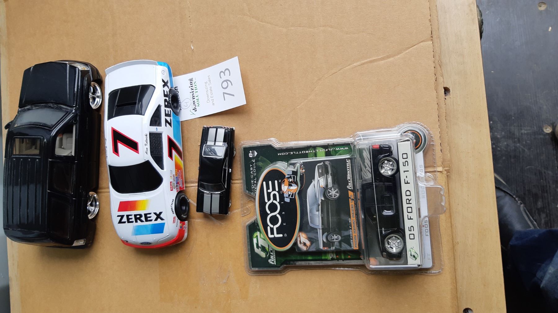 Model of 2002 Escalade. Thunderbird race car, limited edition 1/5000, Alan Kuluwicki driver, 65 Chevy by Foose, F-150 Ford die cast metal by Foose. Pick up 9-10