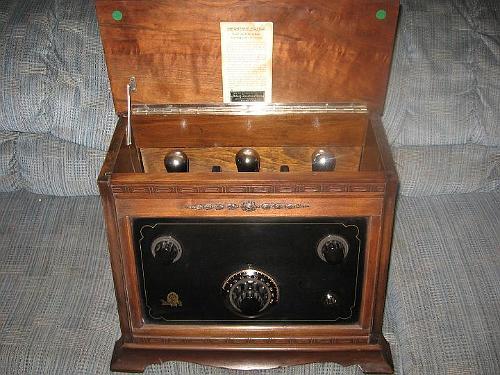 This unusual looking set was the first model introduced by this company and was a major technological breakthrough. All three tuning condensers were placed one behind the other on a single shaft. Mohawk patented this system, which would eventually be used on all modern AM radios. This arrangement of the tuning condensers is what allows the cabinet of this radio to be so differently shaped than other radios of this period. The single tuning dial itself is unique in that the outer ring of the knob is for course tuning while the inner ring uses internal reduction gearing for fine tuning. Wurlitzer, who manufactured the cabinet of this set, eventually took over the company. In 1937, after losing money for years, Wurlitzer quit the radio business to concentrate on its more profitable jukeboxes. no tubes