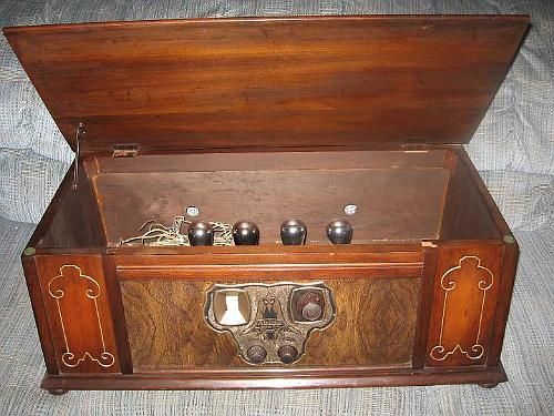 This early 1-dial set is in good original condition inside and out. The chassis is only average in size indicating that the large cabinet was intended to hold the “B” and “C” batteries needed to operate the set no tubes