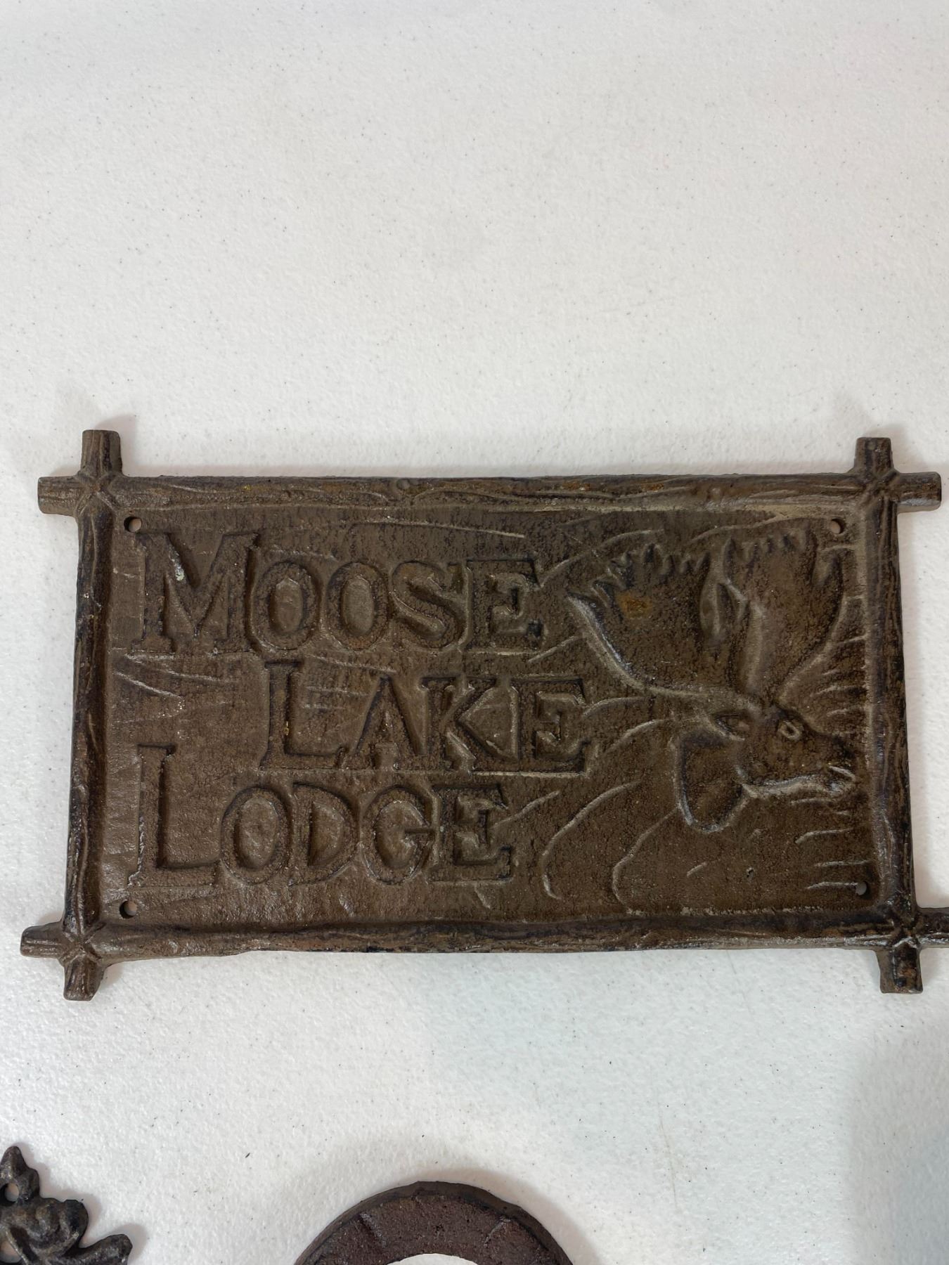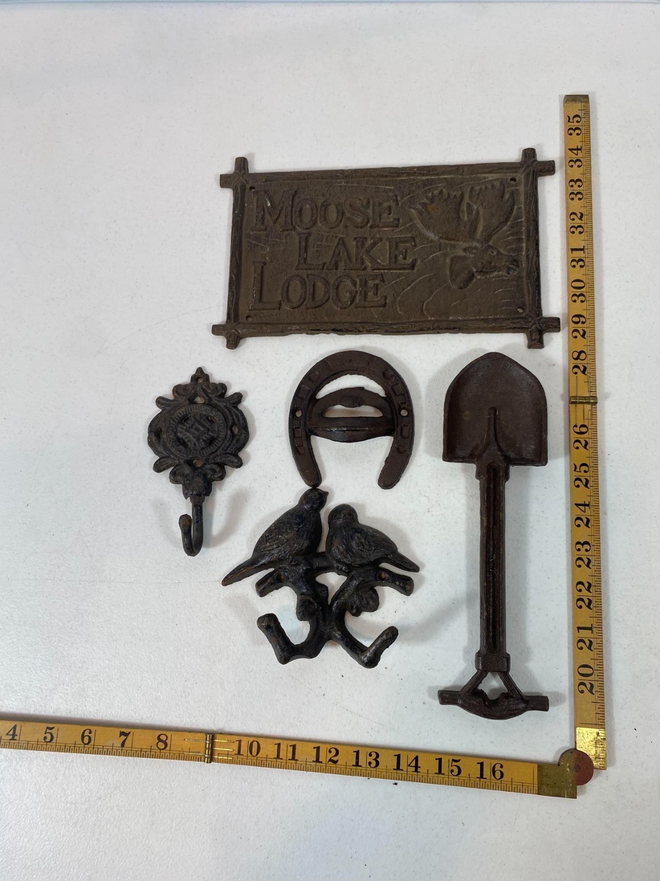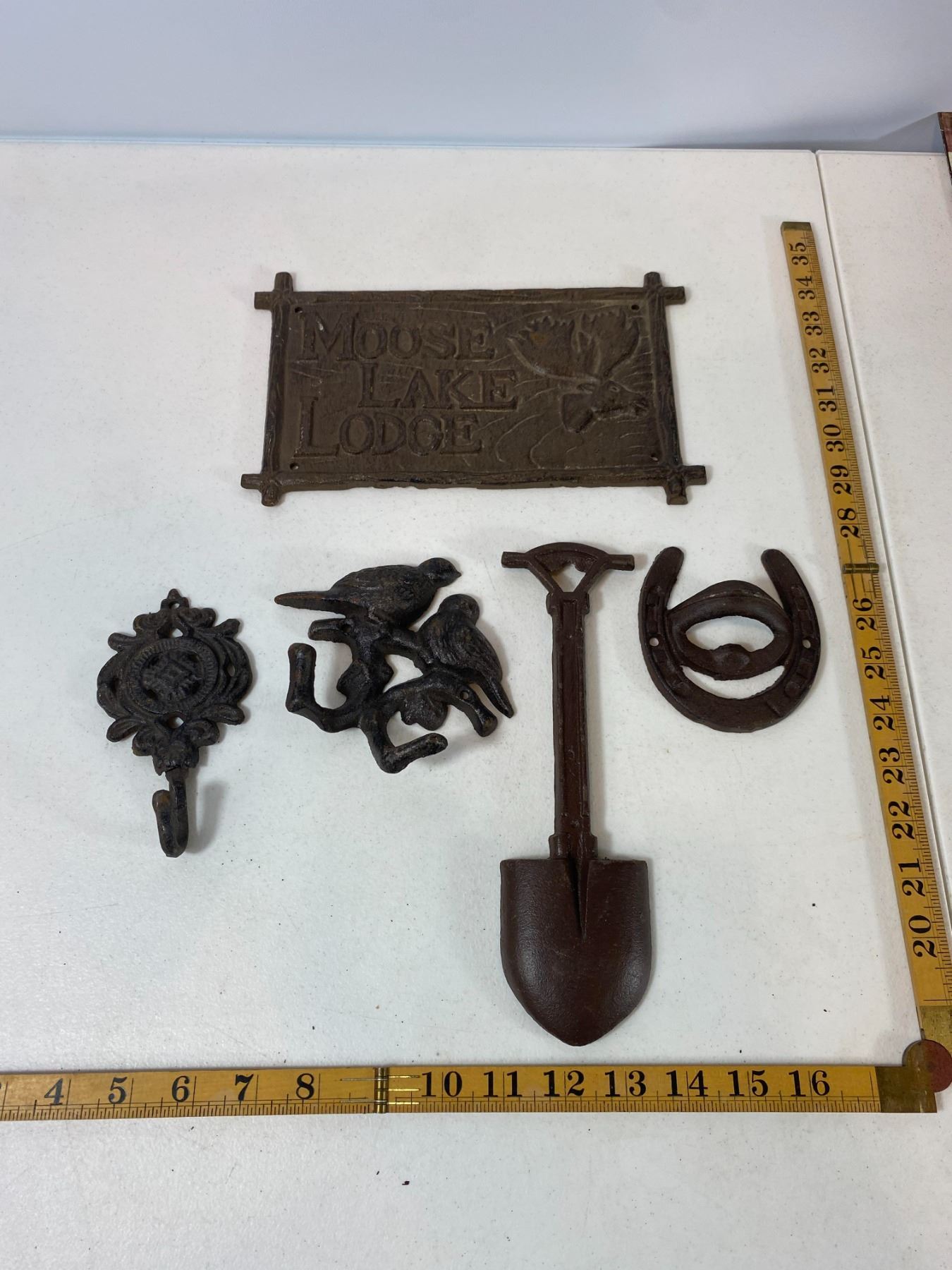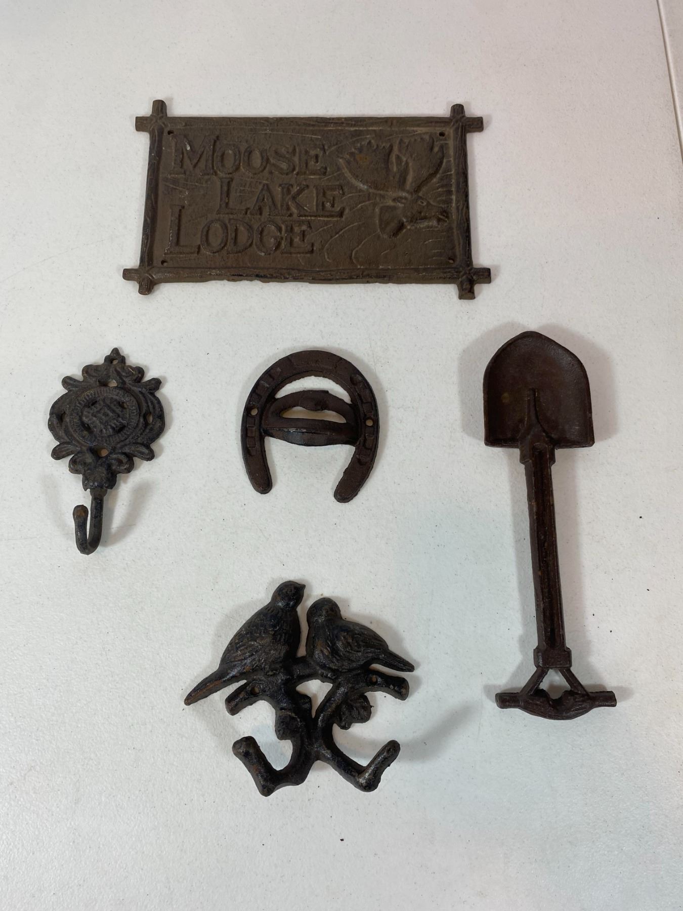 Includes a large 'Moose Lake Lodge' wall plaque, bird pair hook, shovel-shaped wall hook, floral hook and horseshoe hook. Light surface rust and wear. All items are modern reproductions in cast-iron style and offered as decorative collectibles.