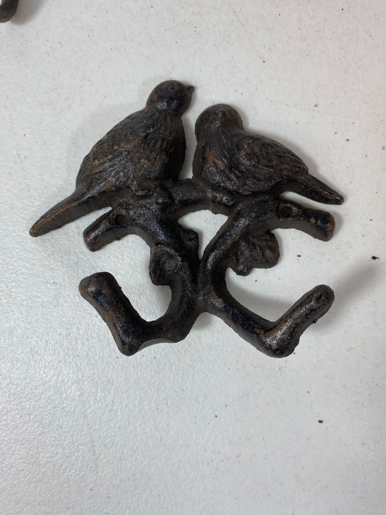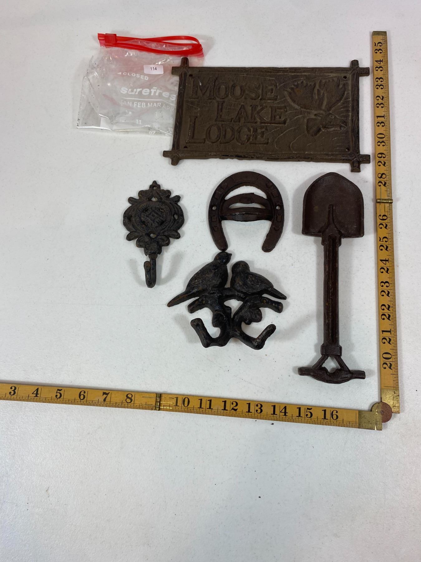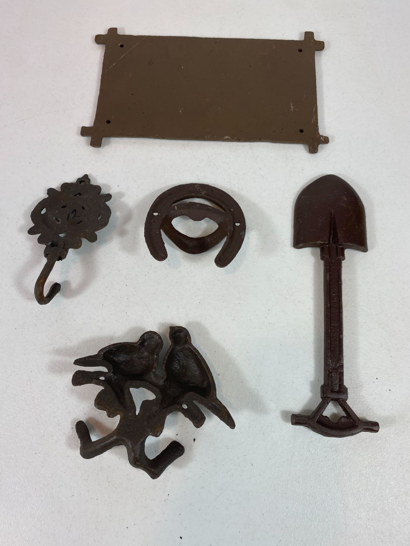 Includes a large 'Moose Lake Lodge' wall plaque, bird pair hook, shovel-shaped wall hook, floral hook and horseshoe hook. Light surface rust and wear. All items are modern reproductions in cast-iron style and offered as decorative collectibles.