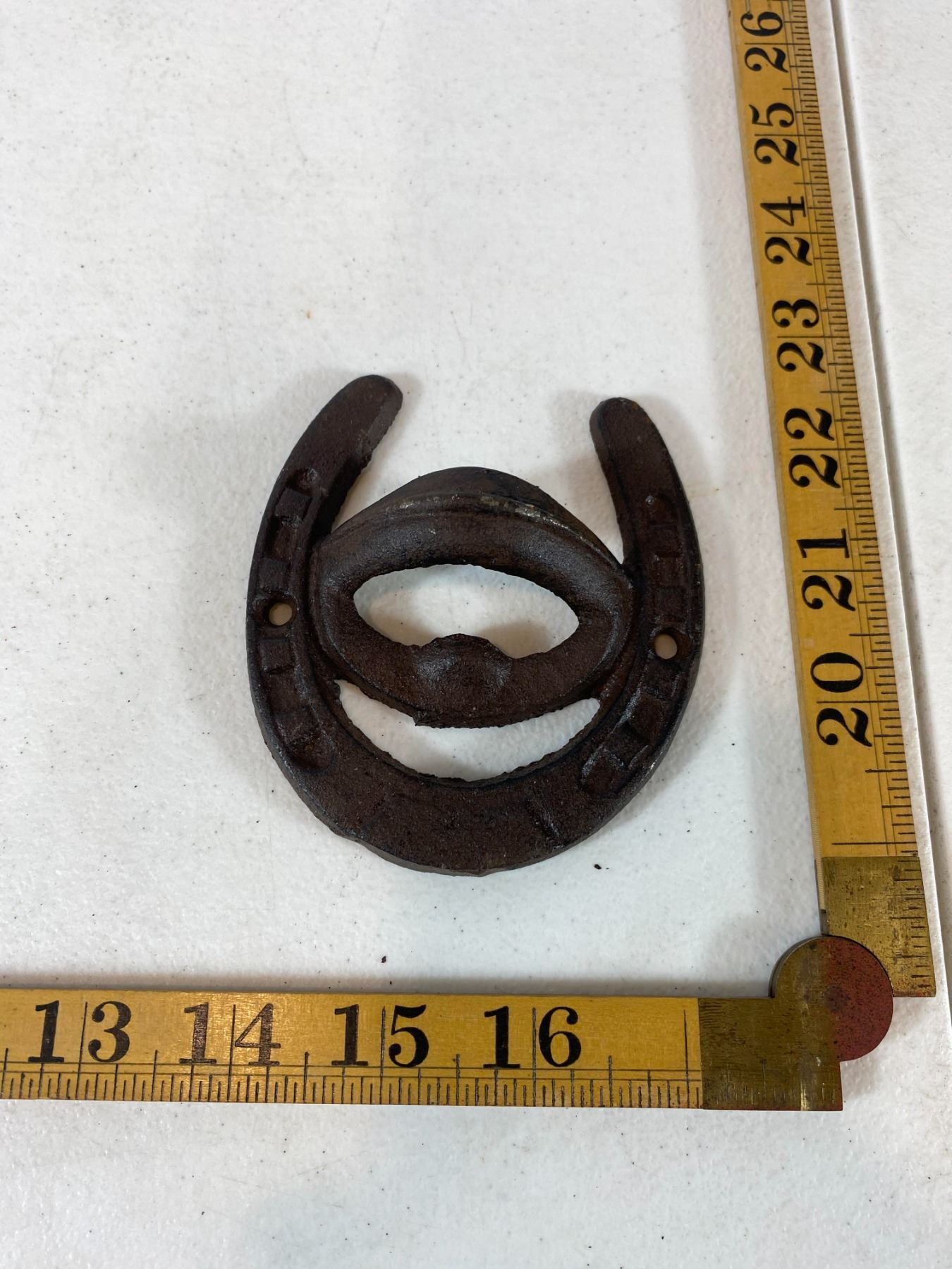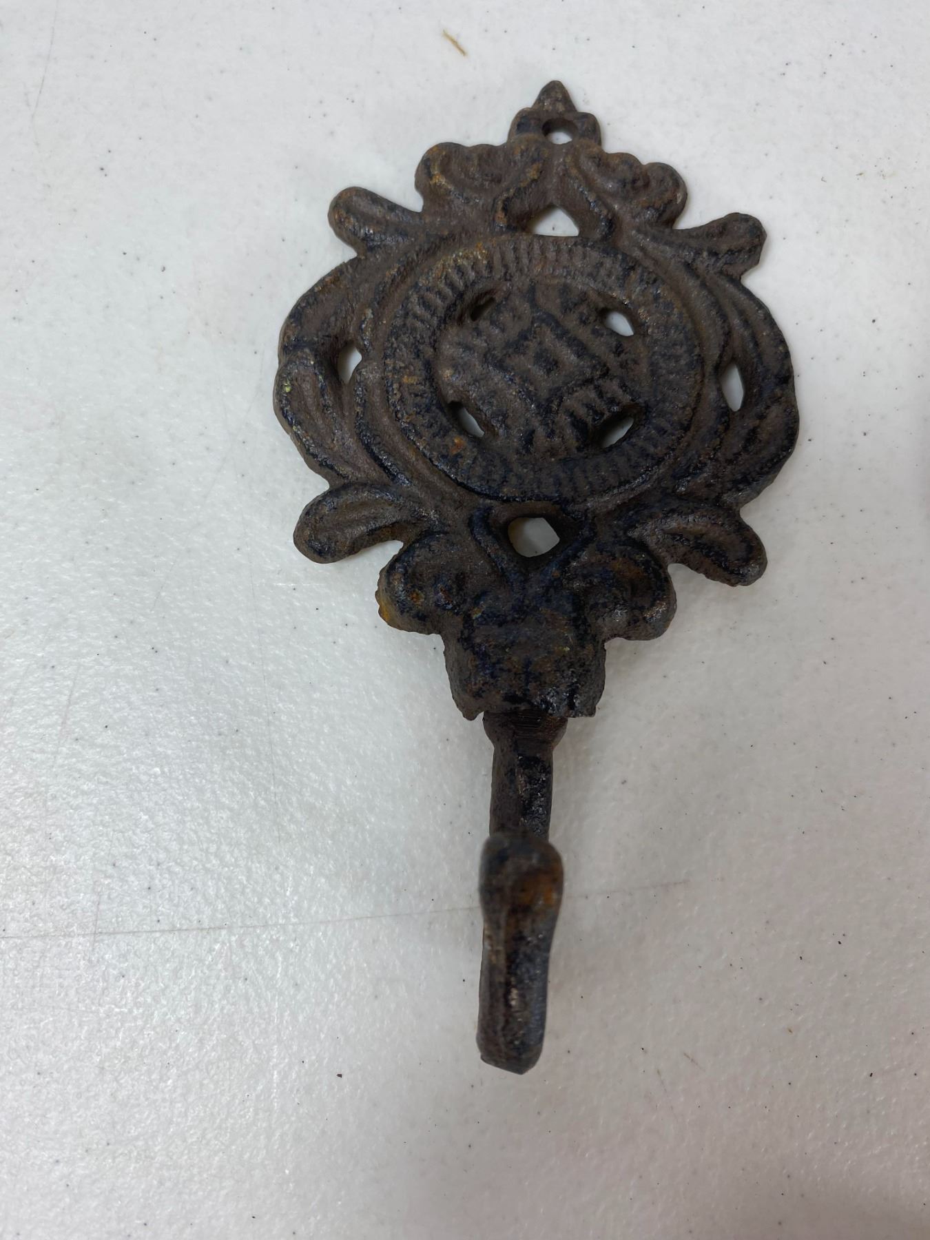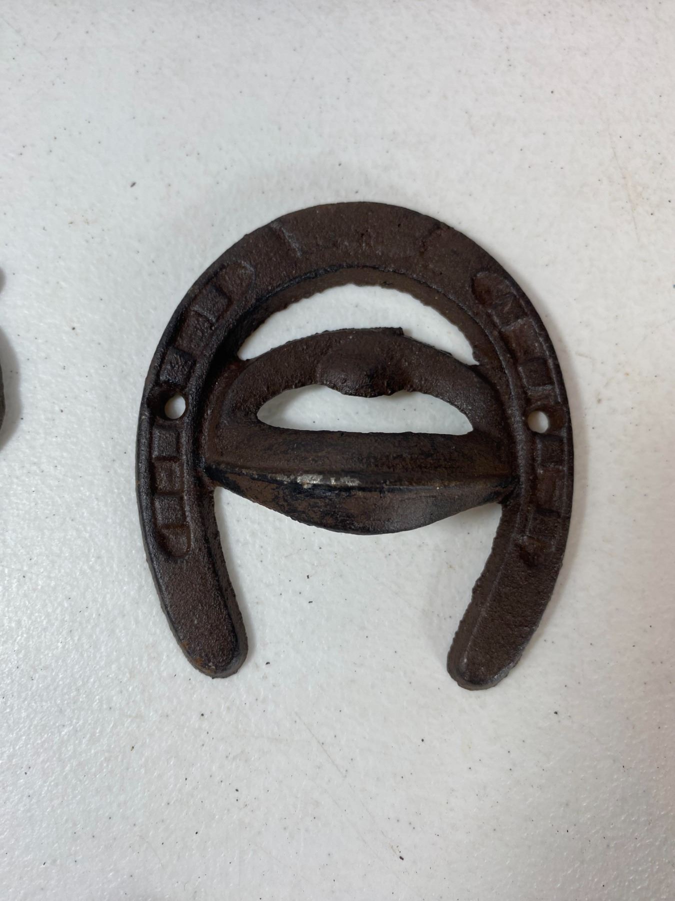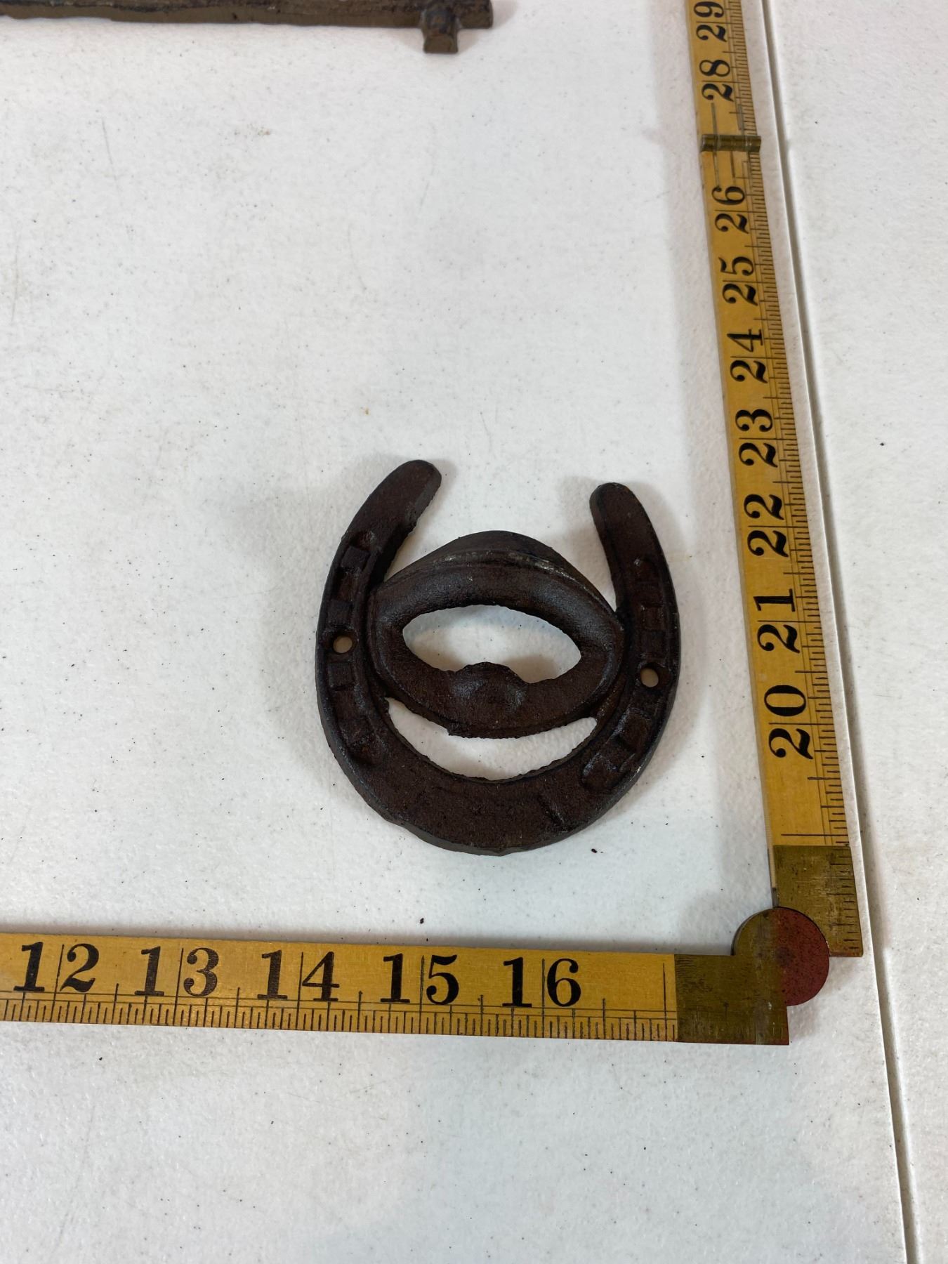 Includes a large 'Moose Lake Lodge' wall plaque, bird pair hook, shovel-shaped wall hook, floral hook and horseshoe hook. Light surface rust and wear. All items are modern reproductions in cast-iron style and offered as decorative collectibles.