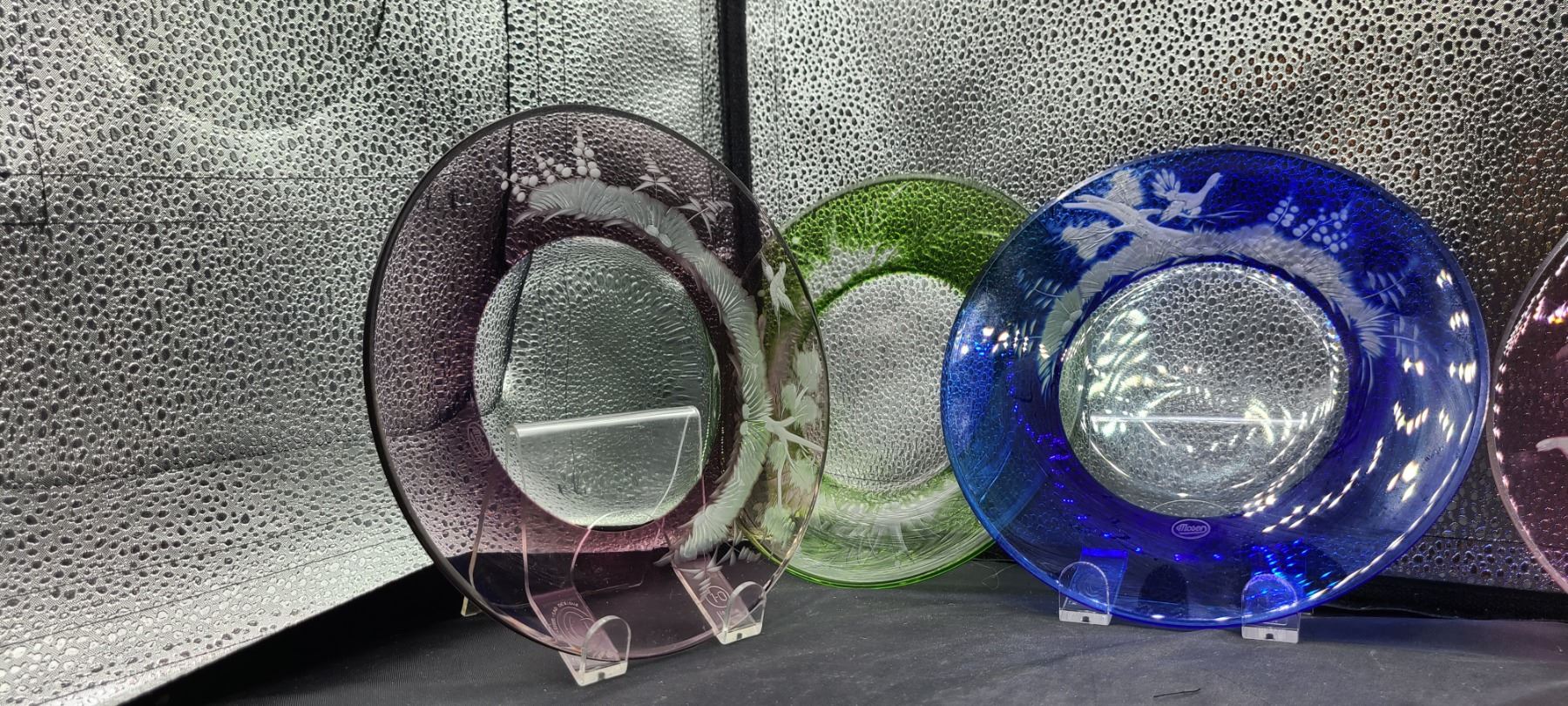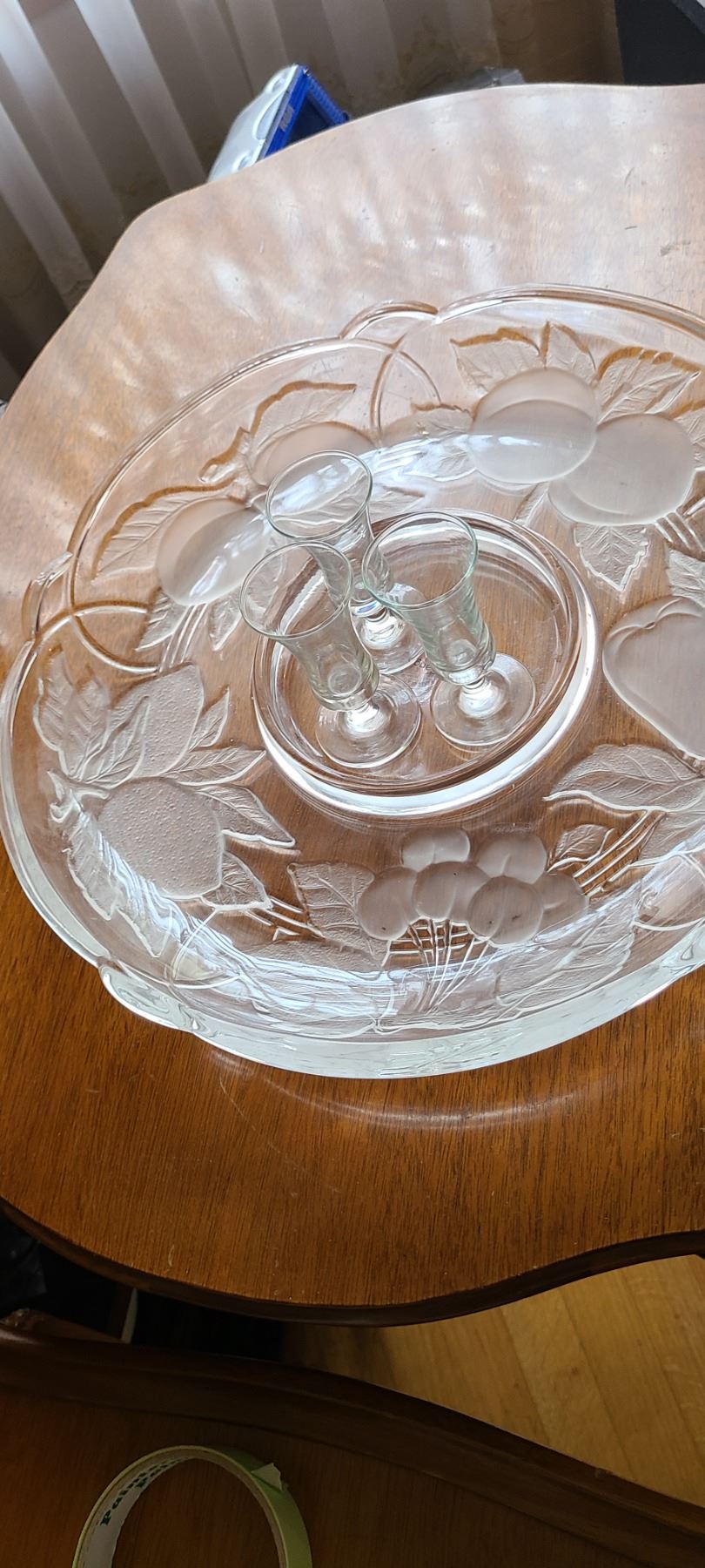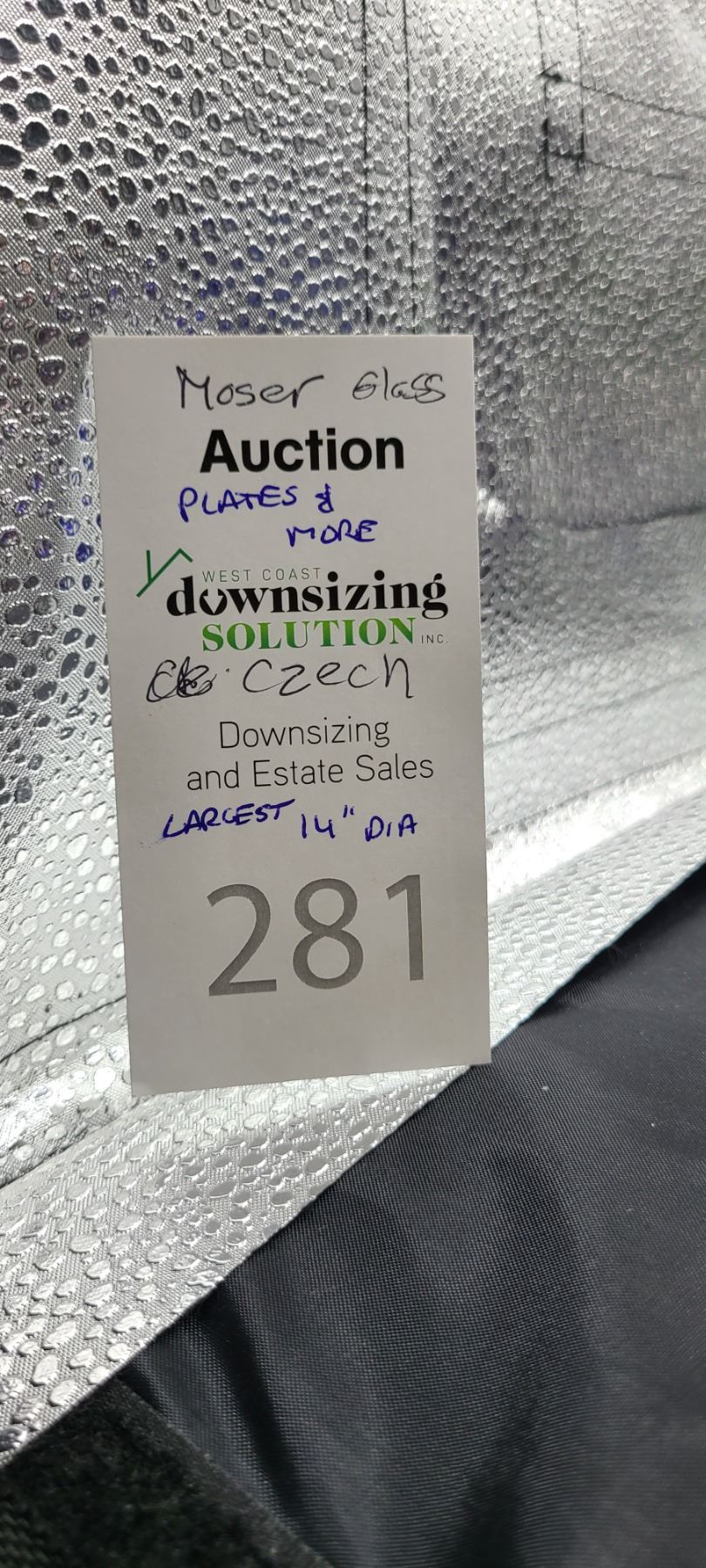 Set of 6 multi coloured Moser Czech plates, glass serving tray 14", shot glasses. Pick up 9-10