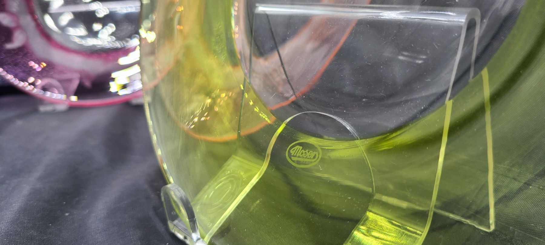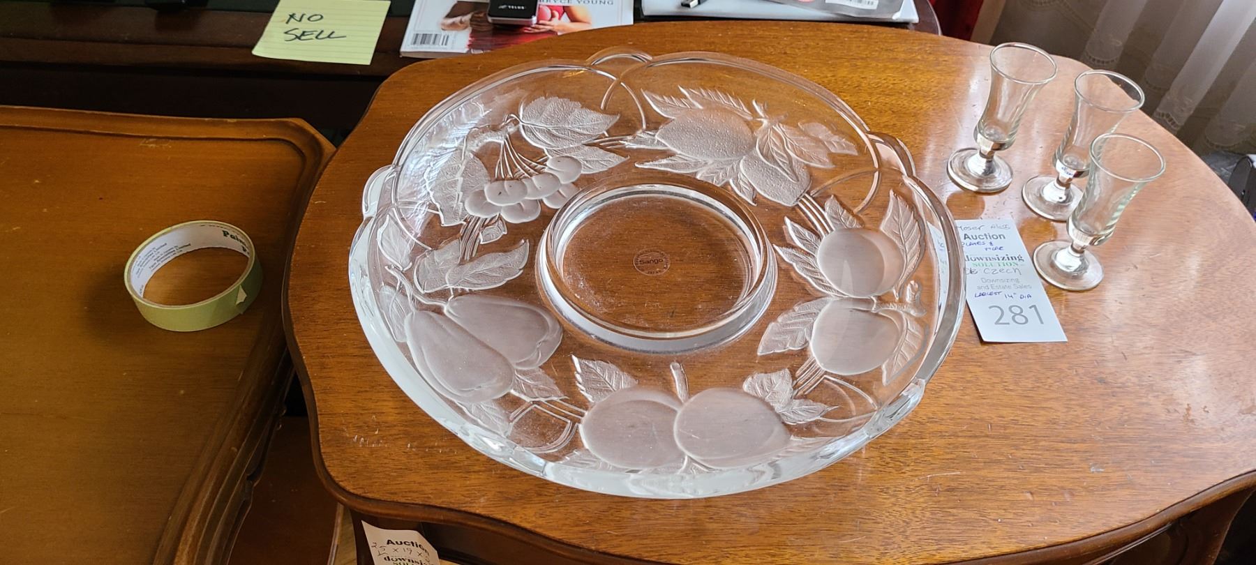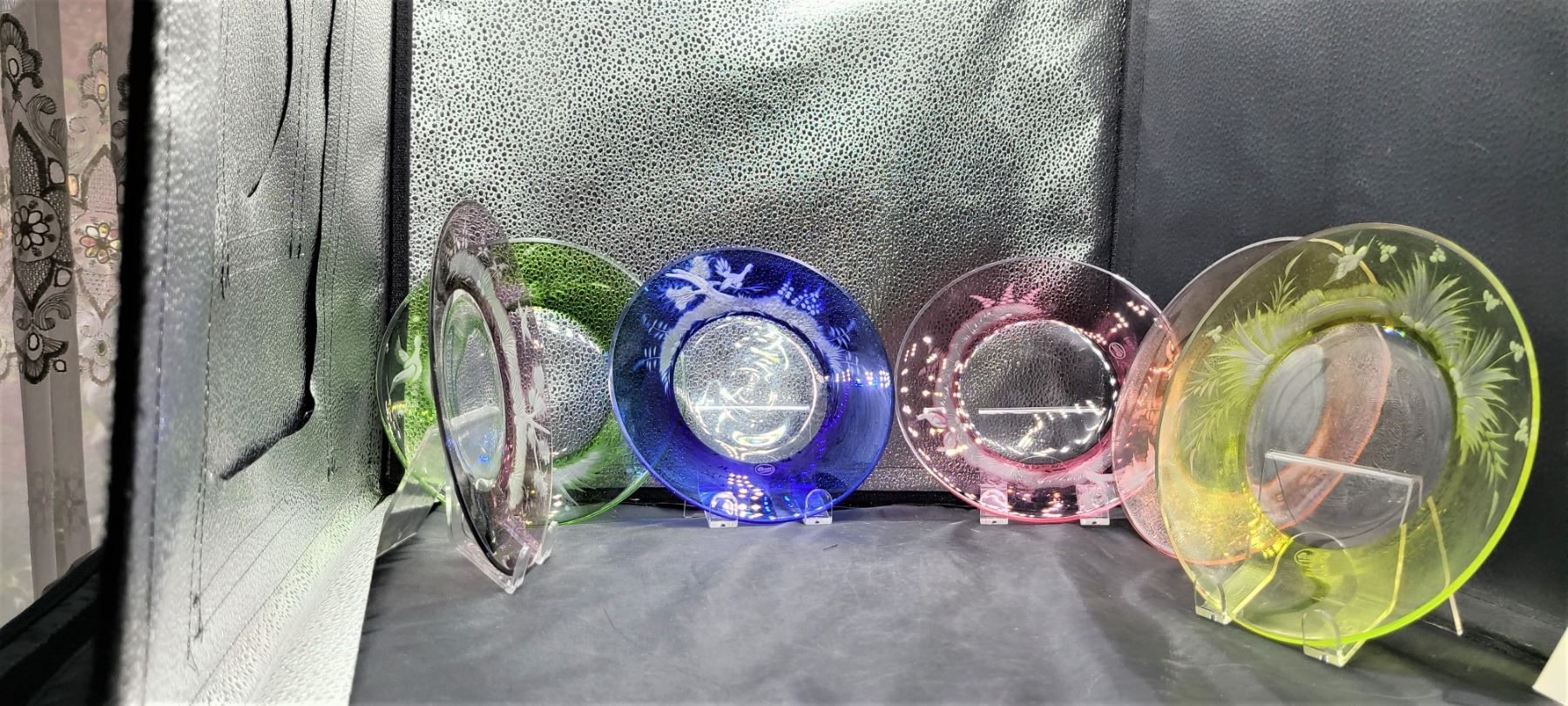 Set of 6 multi coloured Moser Czech plates, glass serving tray 14", shot glasses. Pick up 9-10