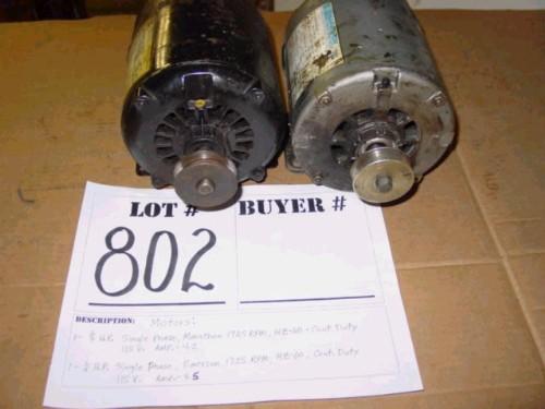 1 - 1/4 H.P. Single Phase, Marathon 1725 RPM, HZ - 60 - Cont. Duty 115 V. AMP. - 4.2 1- 1/4 H.P Single Phase, Emerson 1725 RPM, HZ-60, Cont. Duty 115V. AMP. - 4.5