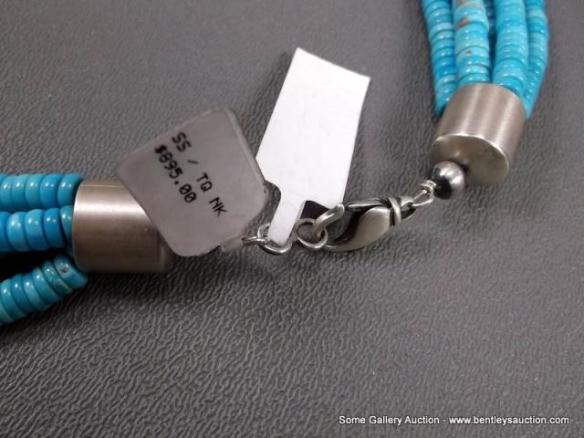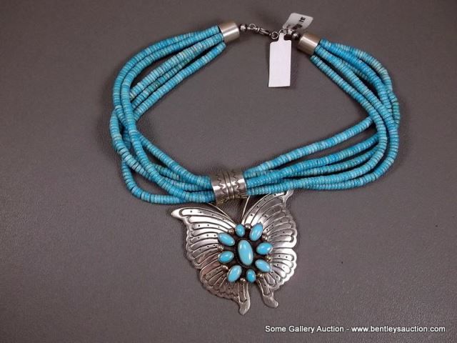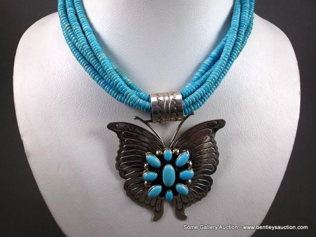Multi Strand Turquoise Beaded Necklace w/ Sterling Silver Butterfly Pendant-Marked D. Livingston Wei