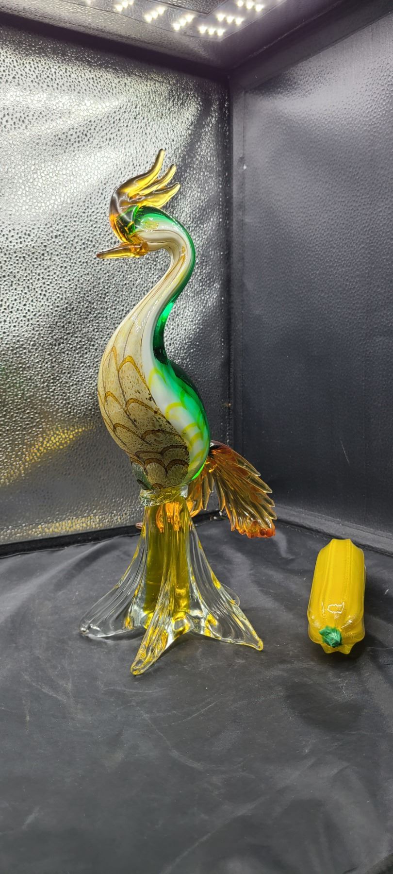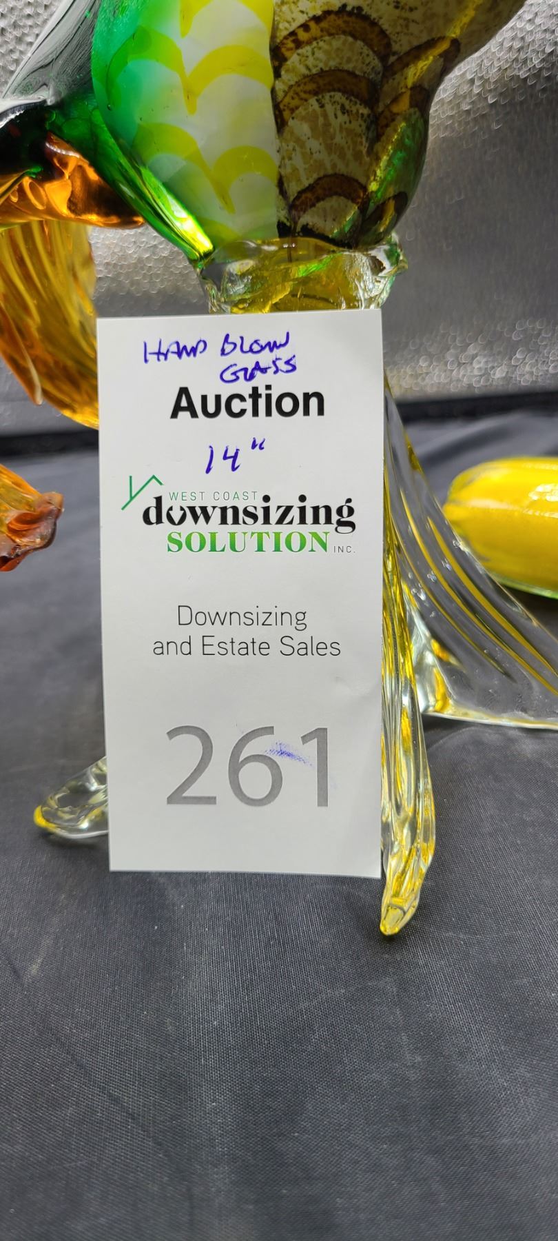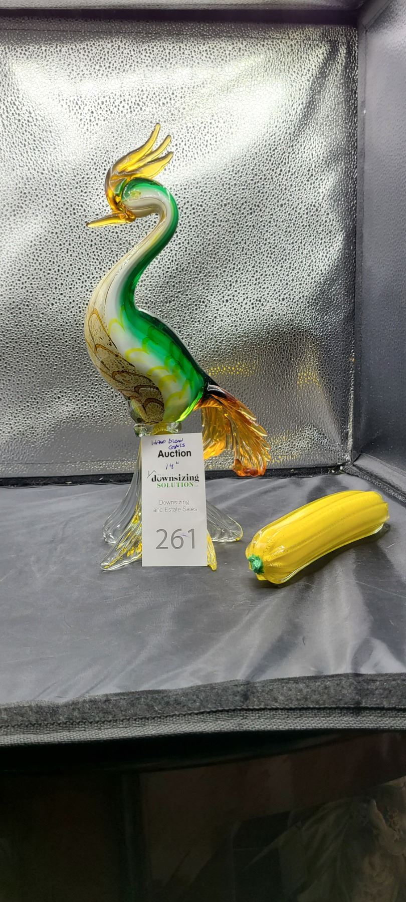 Hand blown glass bird, 14", glass zucchini Bring packing and pickup at 9 am