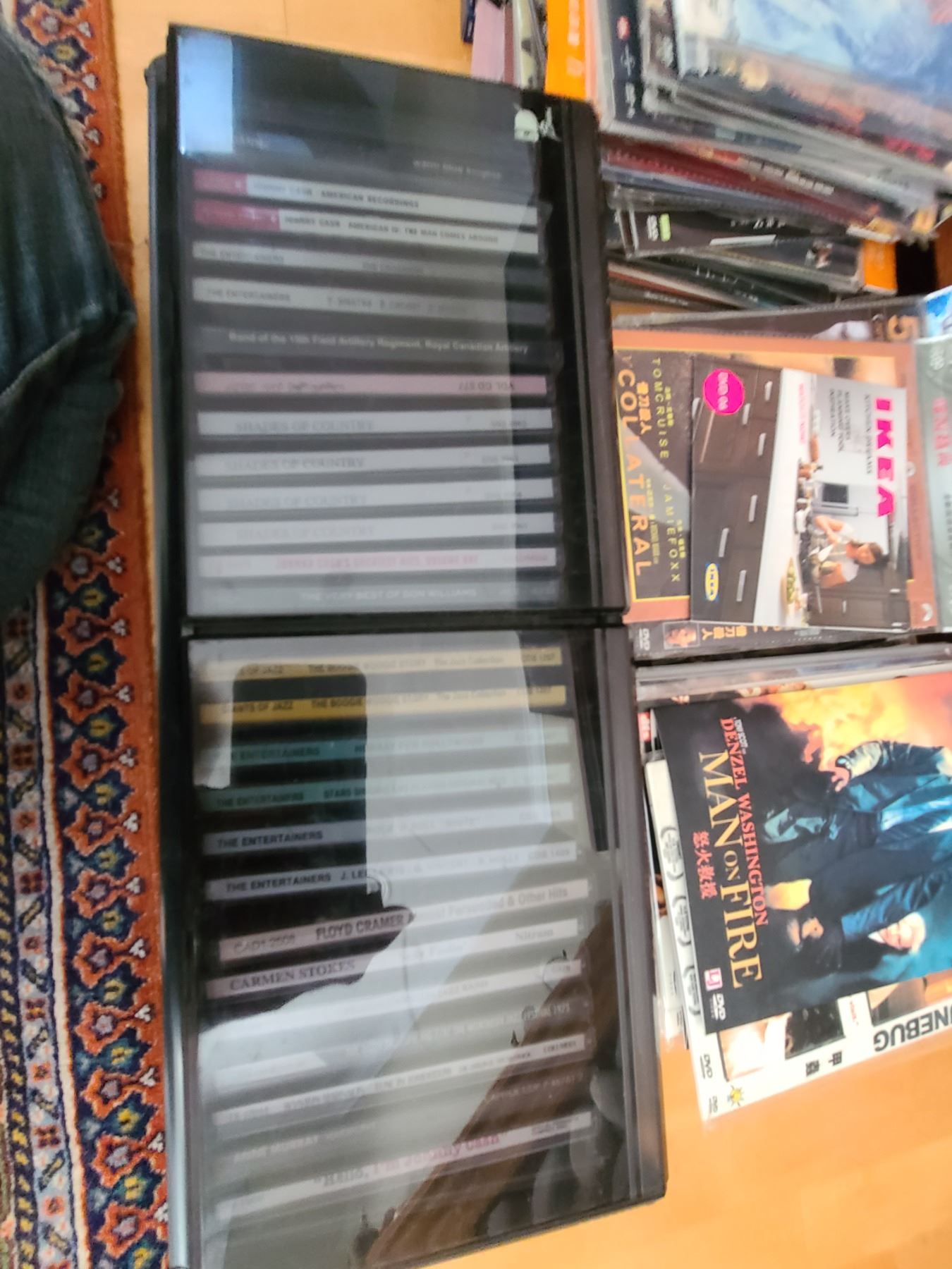 Assortment of phones, mostly older, and various DVDs including container of music. Pickup 9 am.