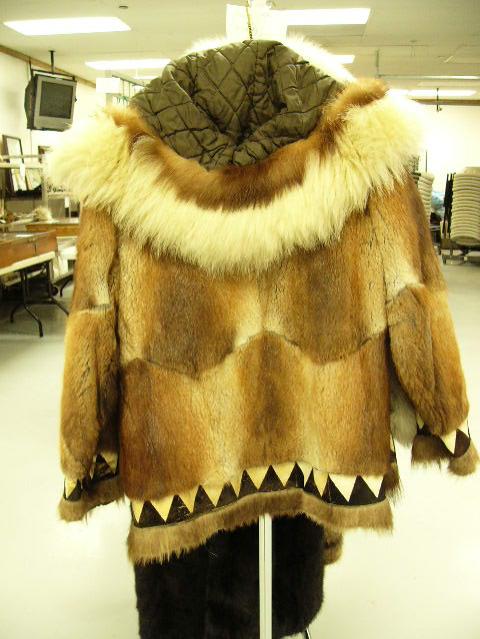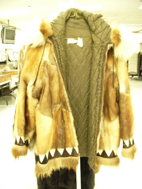 Muskrat coat with wolverine and polar bear fur ruff, with elaborate black and white fur embellishment on trim, approx. size L (28)
