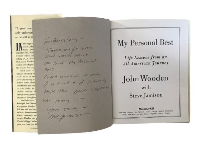 "My Personal Best: Life Lessons from an All American Journey" by John Wooden with Steve Jamison hardcover first edition library found gold foil lettering on spine and high-quality dust jacket title page personally signed to Barry Levy- thank you for your kind words about our book my personal best coach woman is one of a kind and I sincerely hope the book captured his story here yours truly Steve Jamison. Followed by a photograph of John Wooden and autographed by John Wooden in gold marker.