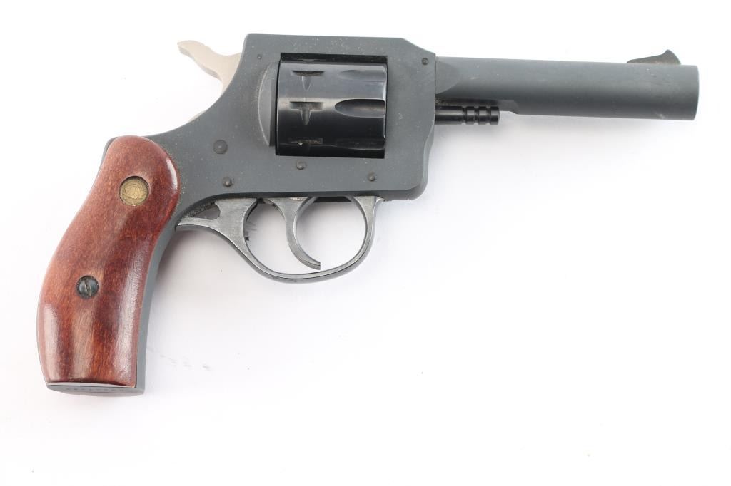 New England Firearms double action 9 shot revolver. Blued, fluted, swing-out cylinder, trigger and triggerguard, matte block frame and 4" barrel ,fixed sights, smooth wood grips with NEF medallions, polished hammer. Action is crisp with tight lock-up, finish is very good with very minor scratches/rubs, grips are excellent and the bore is excellent/bright. Comes with a lot of .22 Cal. Ammo, including box of 56 rds of CCI .22 short, box of 100 rds of CCI .22 LR, box of 26 Federal/CCI. 22 LR, and box of 50 rds of CCI Blazer .22 LR. Total 232 rounds.