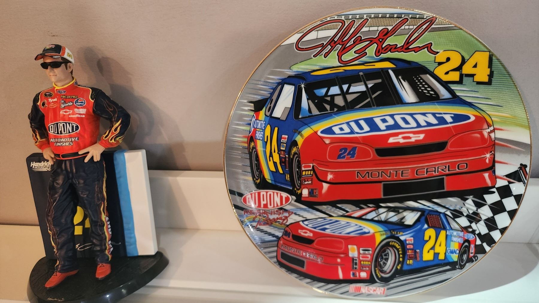 NASCAR Jeff Gordon 4-Pc Collector Set w/ Commemorative Plate, #24 Diecast 1/24 Scale Car, Statue, and Card