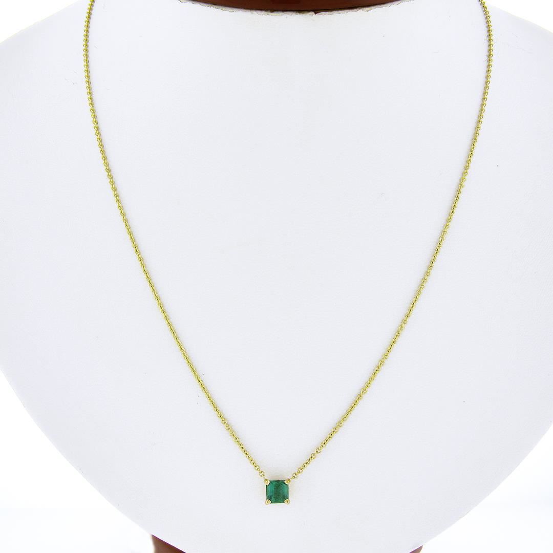A new solid 14k yellow gold pendant necklace, with 1 square cut natural emerald (0.59ct). Adjustable 16 and 18 inch cable link chain, 2.70 grams total weight, pendant measures 5.7x5.6mm.