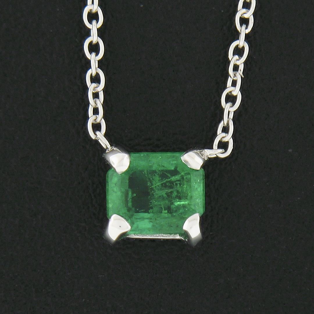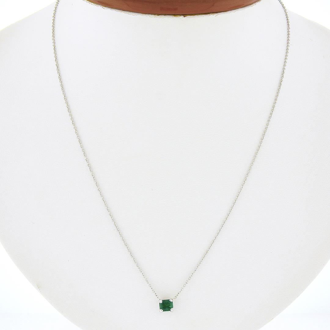 A new solid 14k white gold pendant necklace, with 1 emerald cut natural emerald (0.42 ct). Adjustable at 16 or 18 inch cable link chain, 1.72 grams total weight, pendant measures 5x5.4mm.