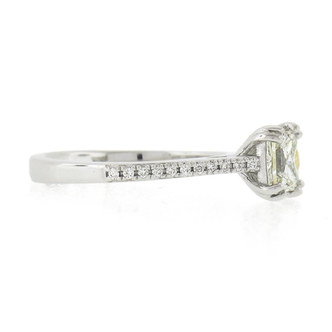 A new solid 14k white gold engagement ring, with 1 GIA graded princess cut natural diamond (L - VS1 ; 1.01ct ), and 22 round brilliant cut natural diamonds (G/H - VS1/VS2 ; 0.11ctw). The ring is size 6.0, weighs a total of 3.35 grams, and measures 6.9mm wide. Comes with all original relevant certifications.