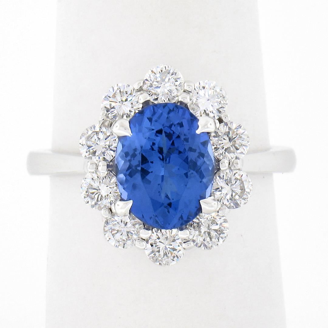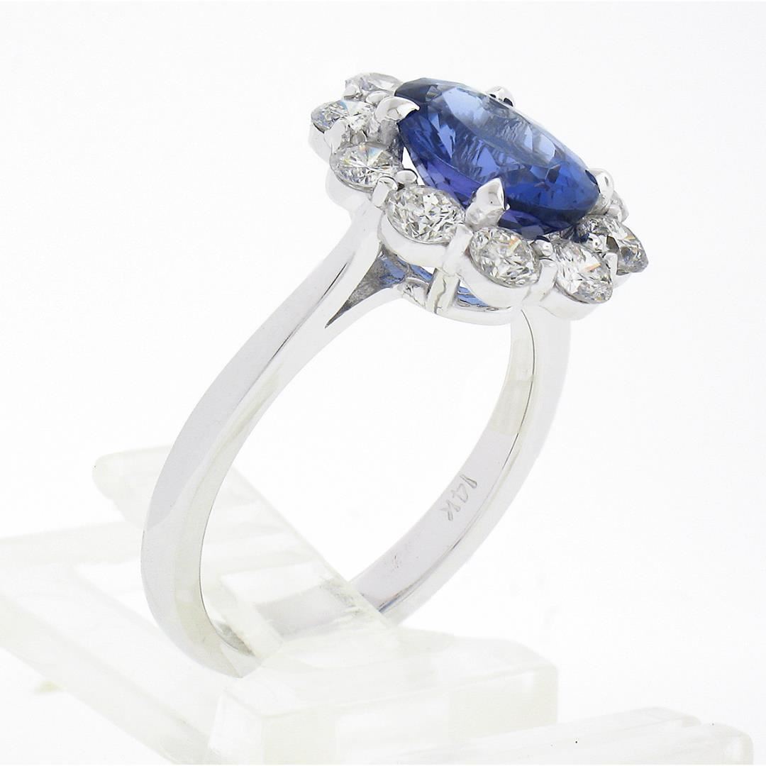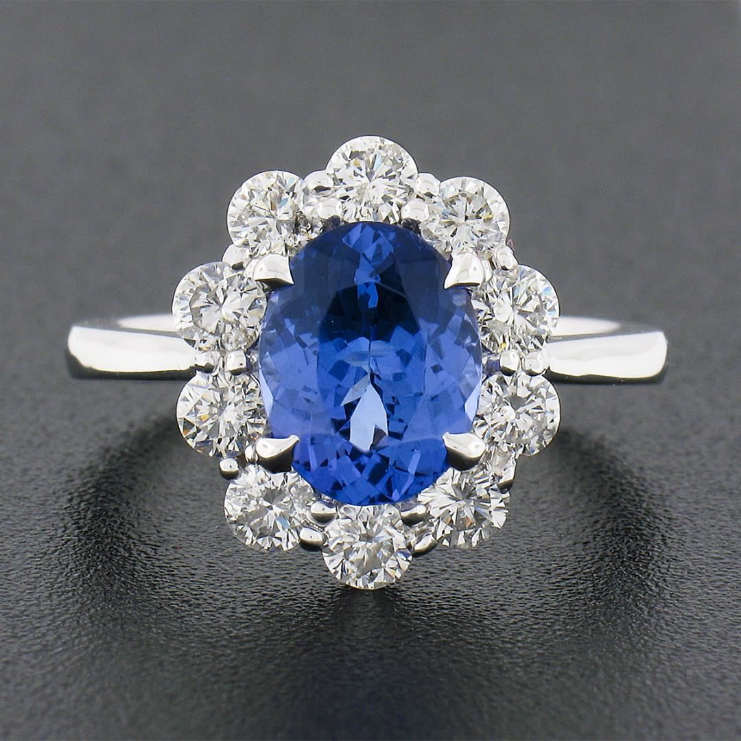 A new solid 14k white gold ring, with 1 oval cut natural tanzanite (9.22x7.22mm / 1.87ct), and a halo of 10 round brilliant cut natural diamonds (F/G - SI1/SI2 ; 1.08ctw). The ring is size 6.5, weighs a total of 4.37 grams, and measures 14.80mm wide.