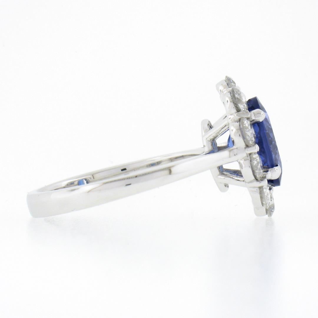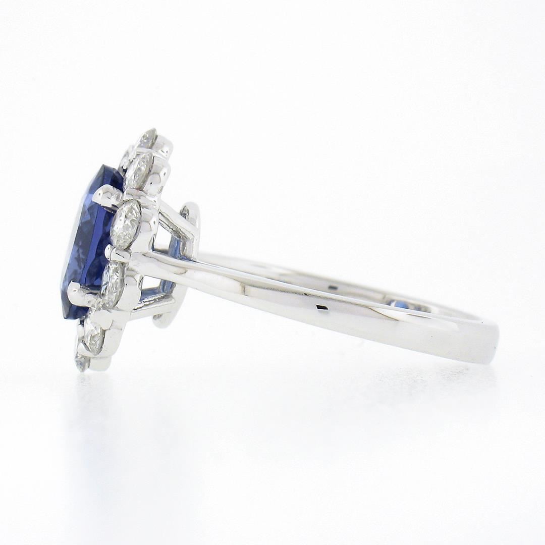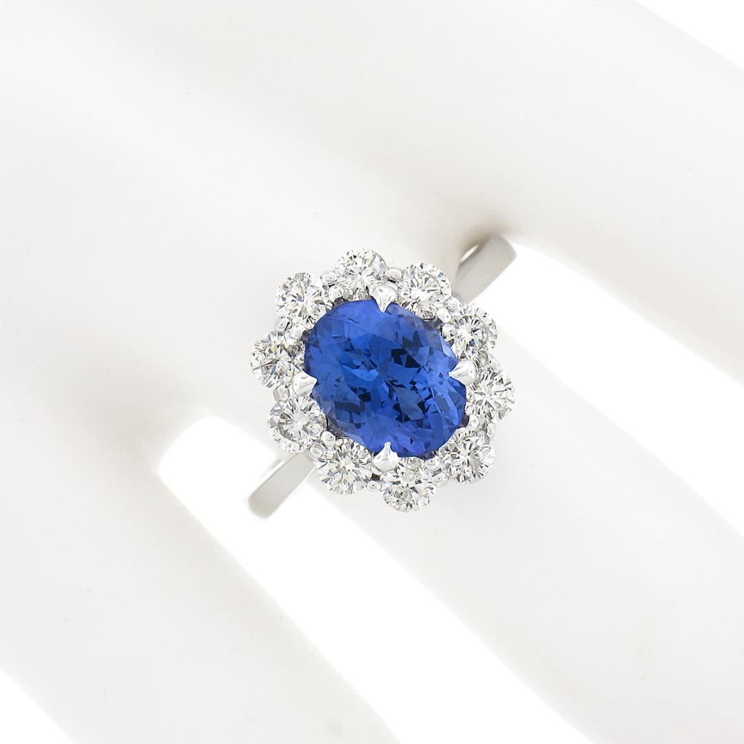 A new solid 14k white gold ring, with 1 oval cut natural tanzanite (9.22x7.22mm / 1.87ct), and a halo of 10 round brilliant cut natural diamonds (F/G - SI1/SI2 ; 1.08ctw). The ring is size 6.5, weighs a total of 4.37 grams, and measures 14.80mm wide.