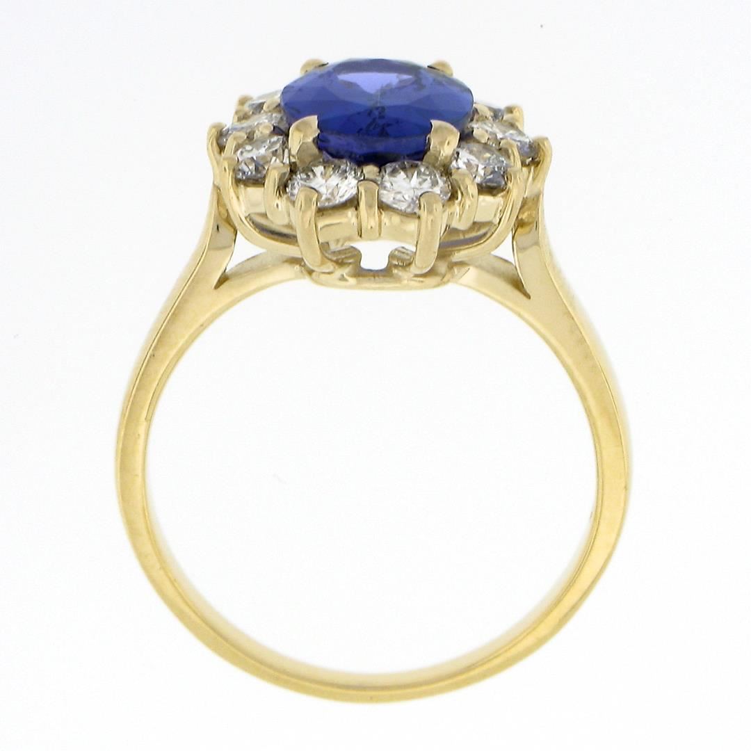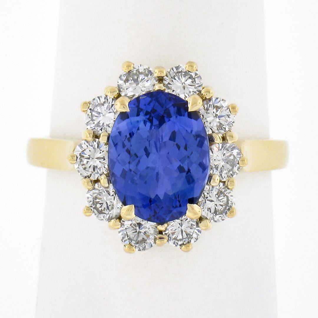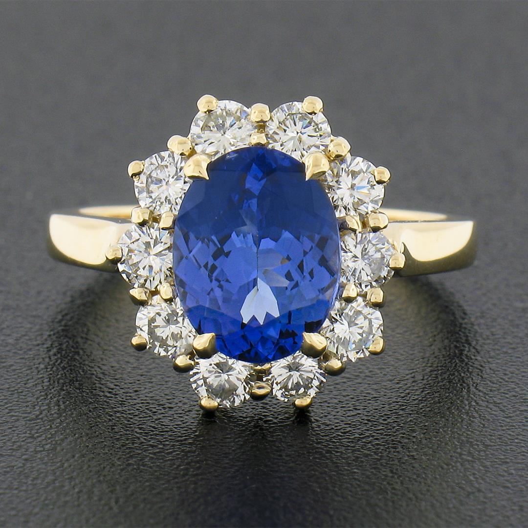 A new solid 14k yellow gold ring, with 1 oval cut natural tanzanite (9.1x7.1mm - 1.98ct ), and a halo of 10 round brilliant cut natural diamonds (G/H - VS2/SI1 ; 0.88ctw). The ring is size 6.0, weighs a total of 3.95 grams, and measures 13.50mm wide.
