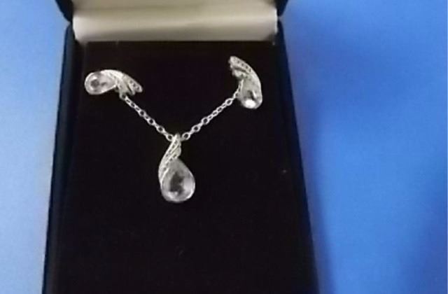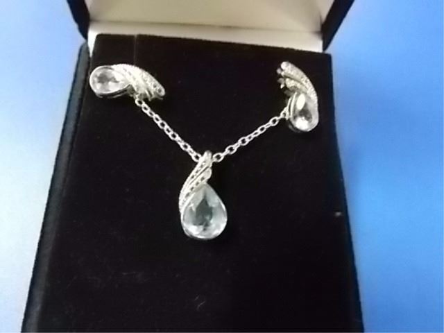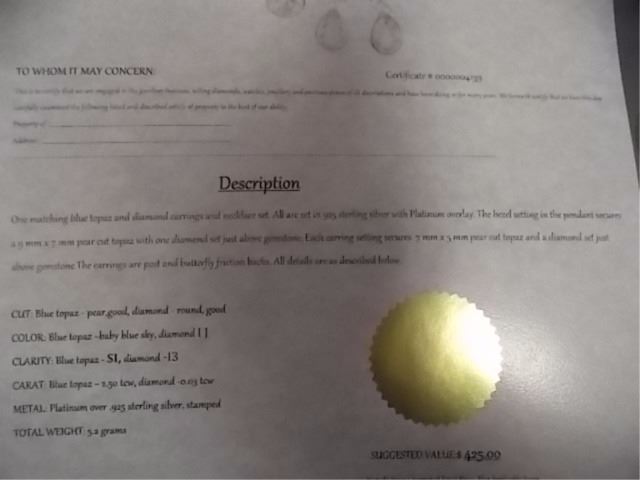 NEW EARRINGS & NECKLACE SET - NEW 2.5CT PEAR FACETED BLUE TOPAZ & DIAMONDS IN STERLING SILVER SETTING - INCLUDES $425 CERTIFICATE