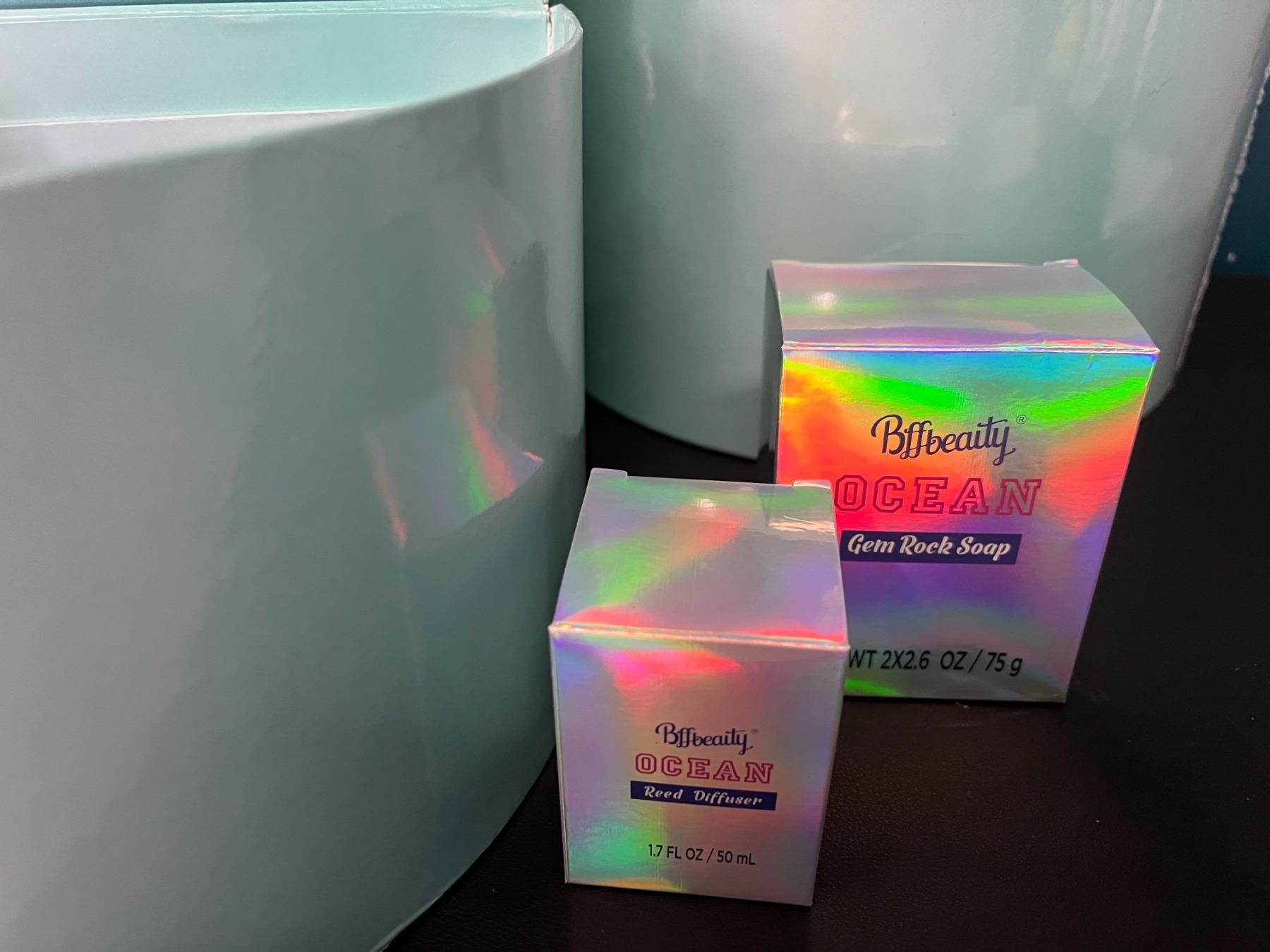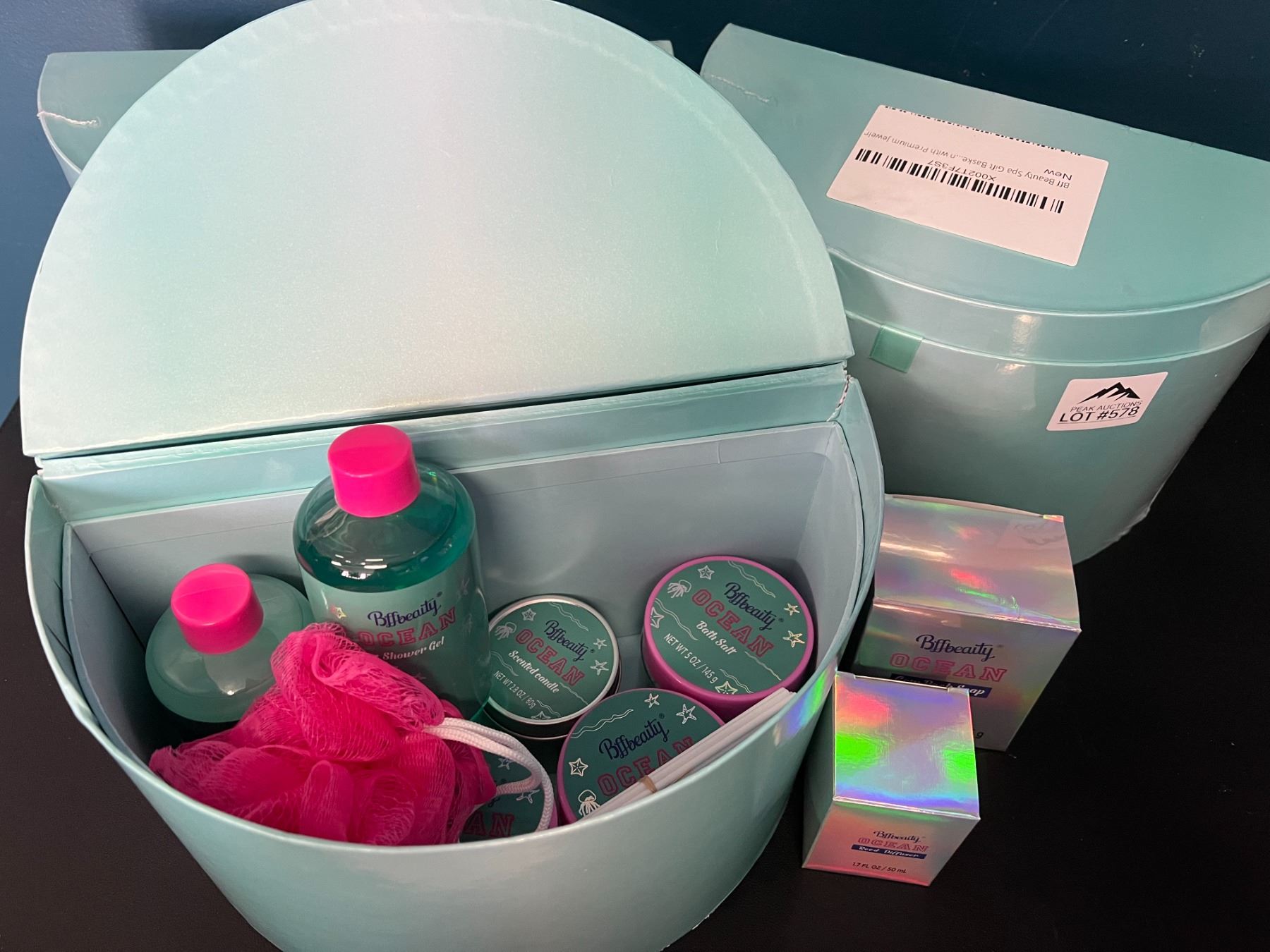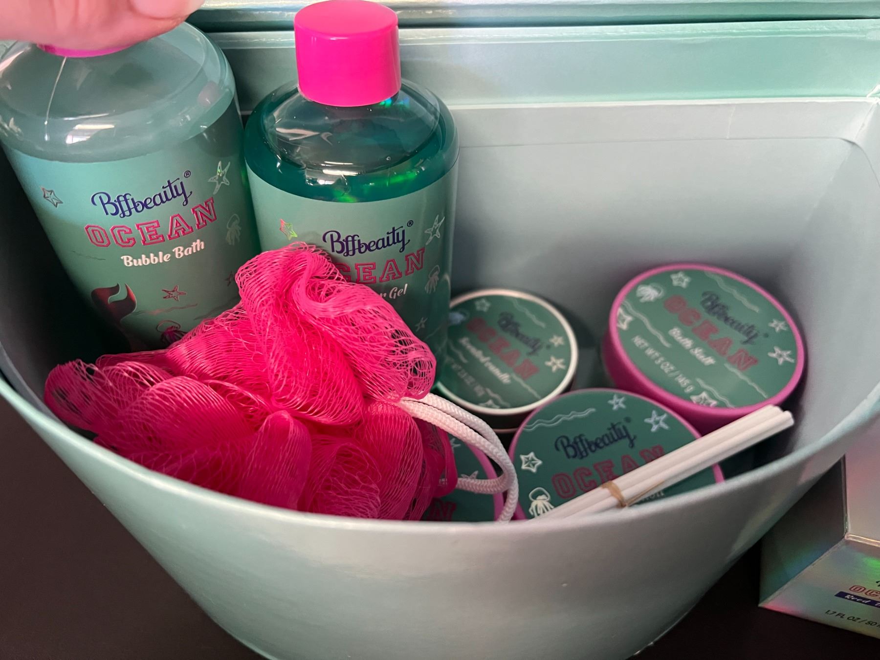 - includes bubble bath, shower gel, bath salts, scented candle, 2 gem roack soaps, reed diffuser, body lotion, hand cream, and bath puff sponge