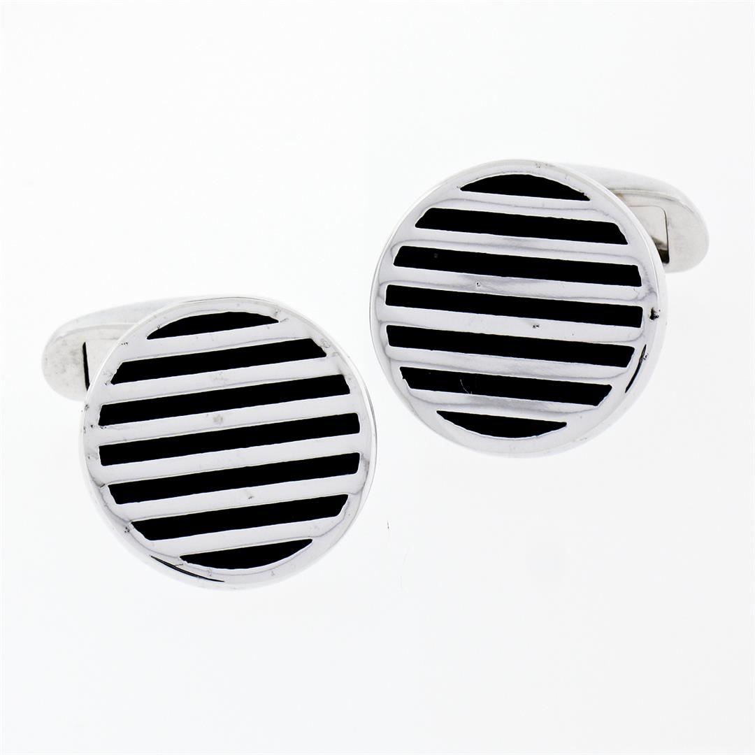A new solid 14k white gold ribbed cufflinks. These cuff links have a swivel design with a clearance of 13.0mm, weigh a total of 9.50 grams, and the front panels measure 15.50mm in diameter.