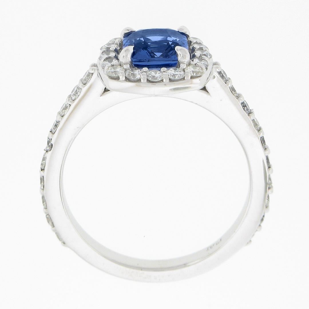 A new solid platinum ring, with 1 GIA graded cushion cut natural sapphire (NO HEAT - 1.15ct), surrounded with a halo of 36 round brilliant cut natural diamonds (F/G - VS1/VS2 ; 0.74ctw). The ring is size 6.5, weighs a total of 6.88 grams, and measures 10.75mm wide. Comes with all original relevant certifications.