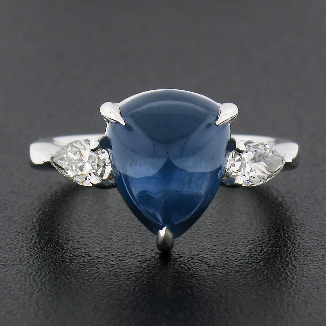 A new platinum ring, with 1 GUBELIN graded triangle cabochon cut natural sapphire (5.11ct), and 2 pear cut natural diamonds (G/H - VS1/VS2 ; 0.52ctw). The ring is size 6.5, weighs a total of 6.58 grams, and measures 11.8mm wide. Comes with all original relevant certifications.