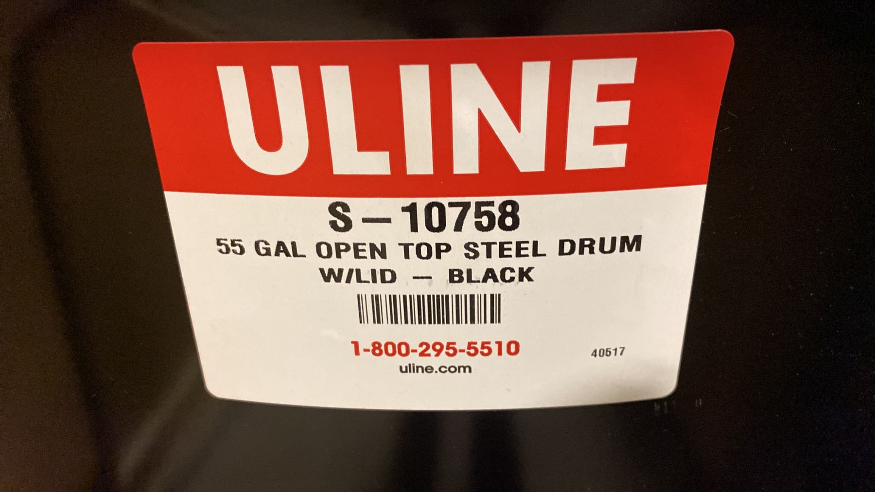 NEW ULINE 55 GAL OPEN TOP STEEL DRUM BARREL WITH LID - BLACK