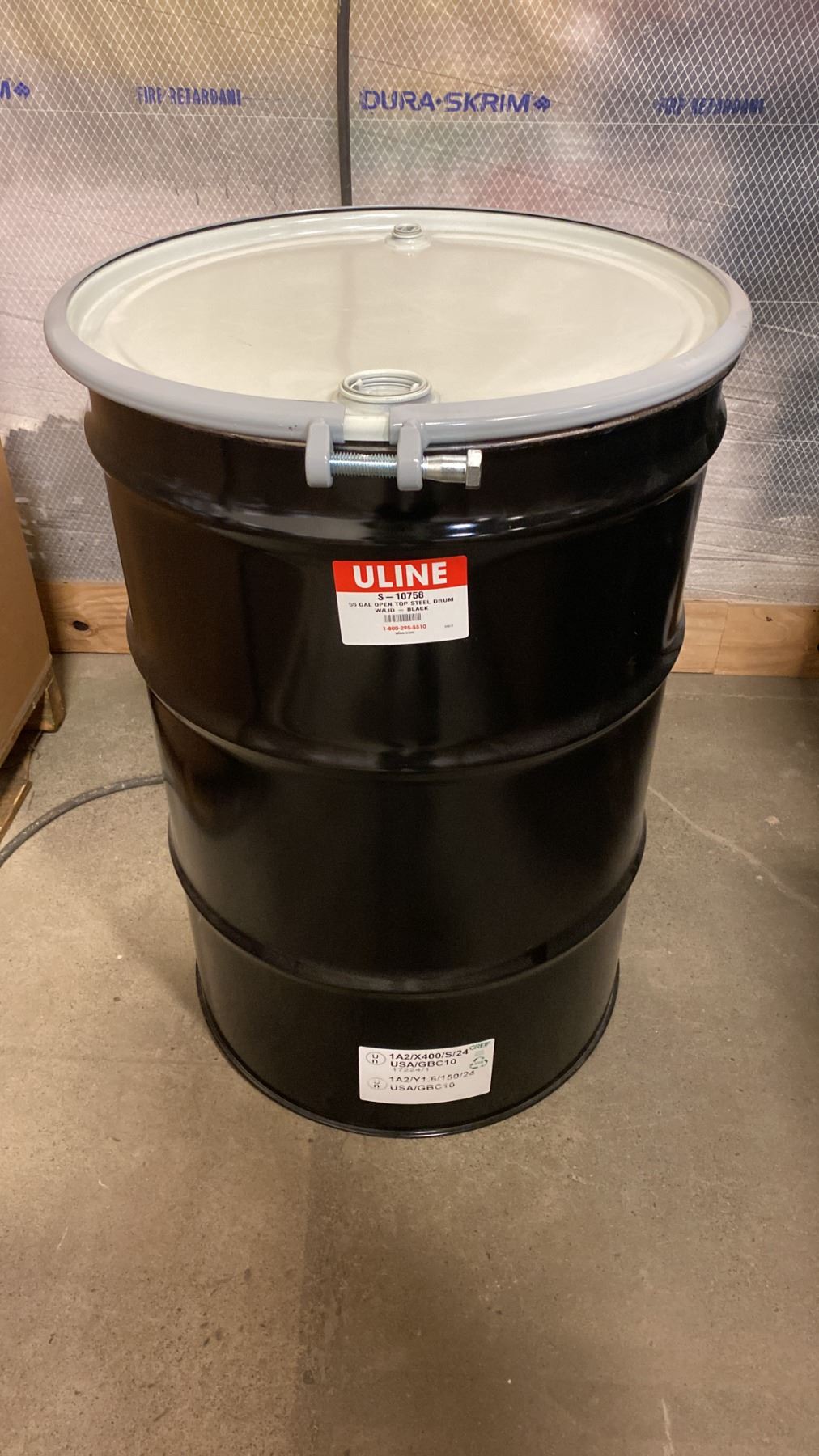 NEW ULINE 55 GAL OPEN TOP STEEL DRUM BARREL WITH LID - BLACK