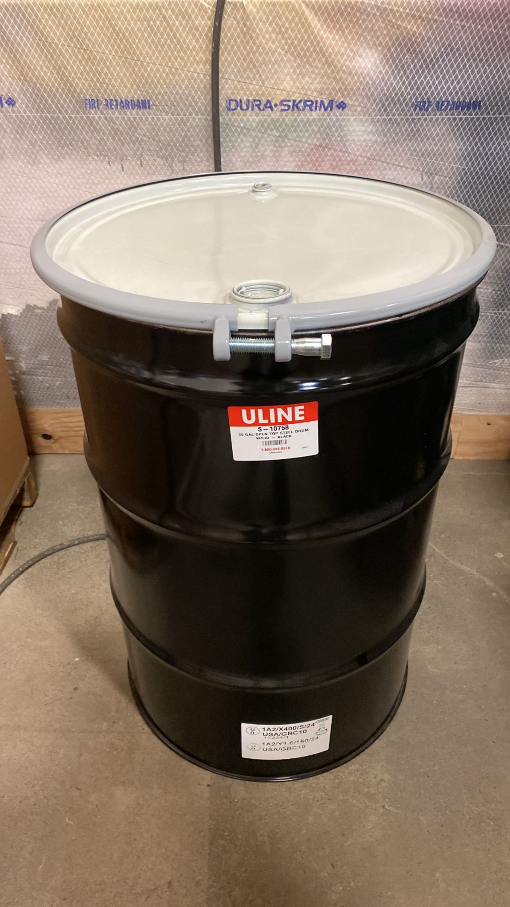 NEW ULINE 55 GAL OPEN TOP STEEL DRUM BARREL WITH LID - BLACK