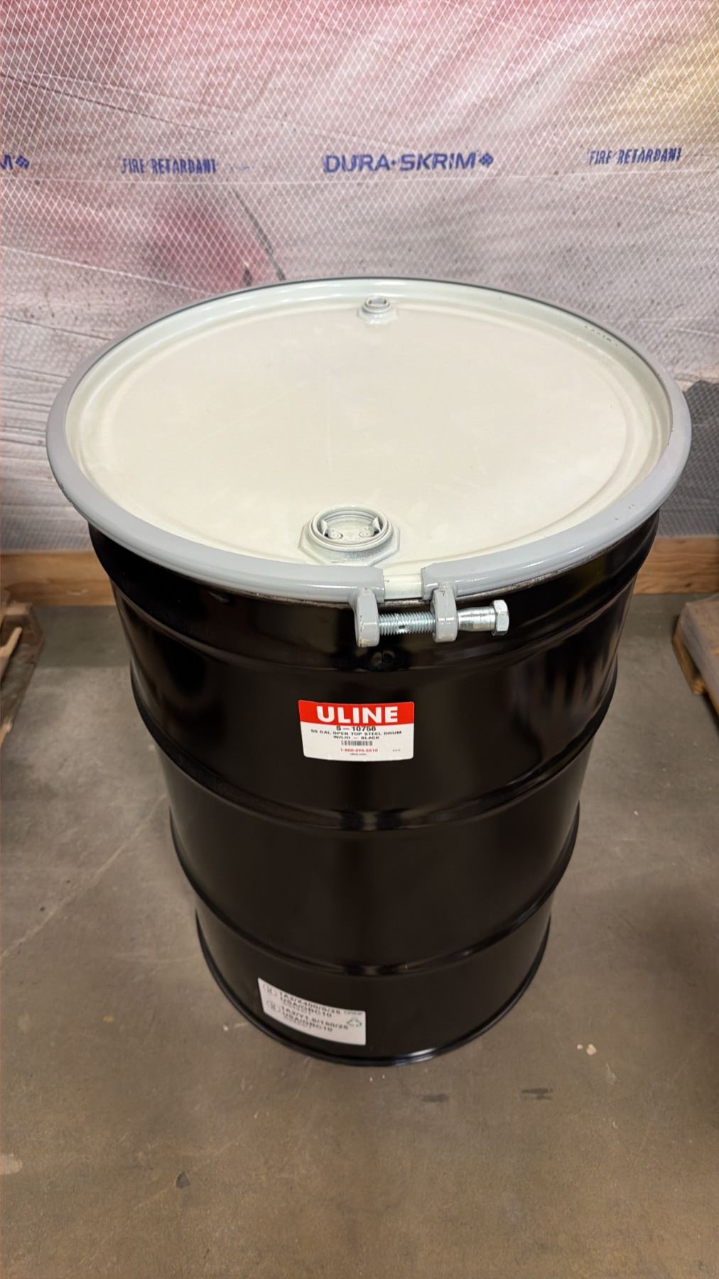 NEW ULINE 55 GAL OPEN TOP STEEL DRUM BARREL WITH LID - BLACK