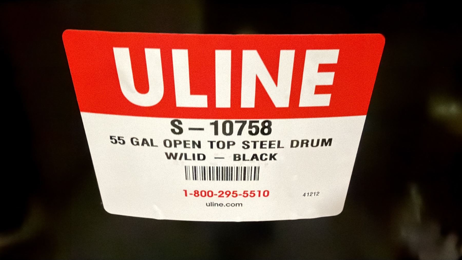 NEW ULINE 55 GAL OPEN TOP STEEL DRUM BARREL WITH LID - BLACK