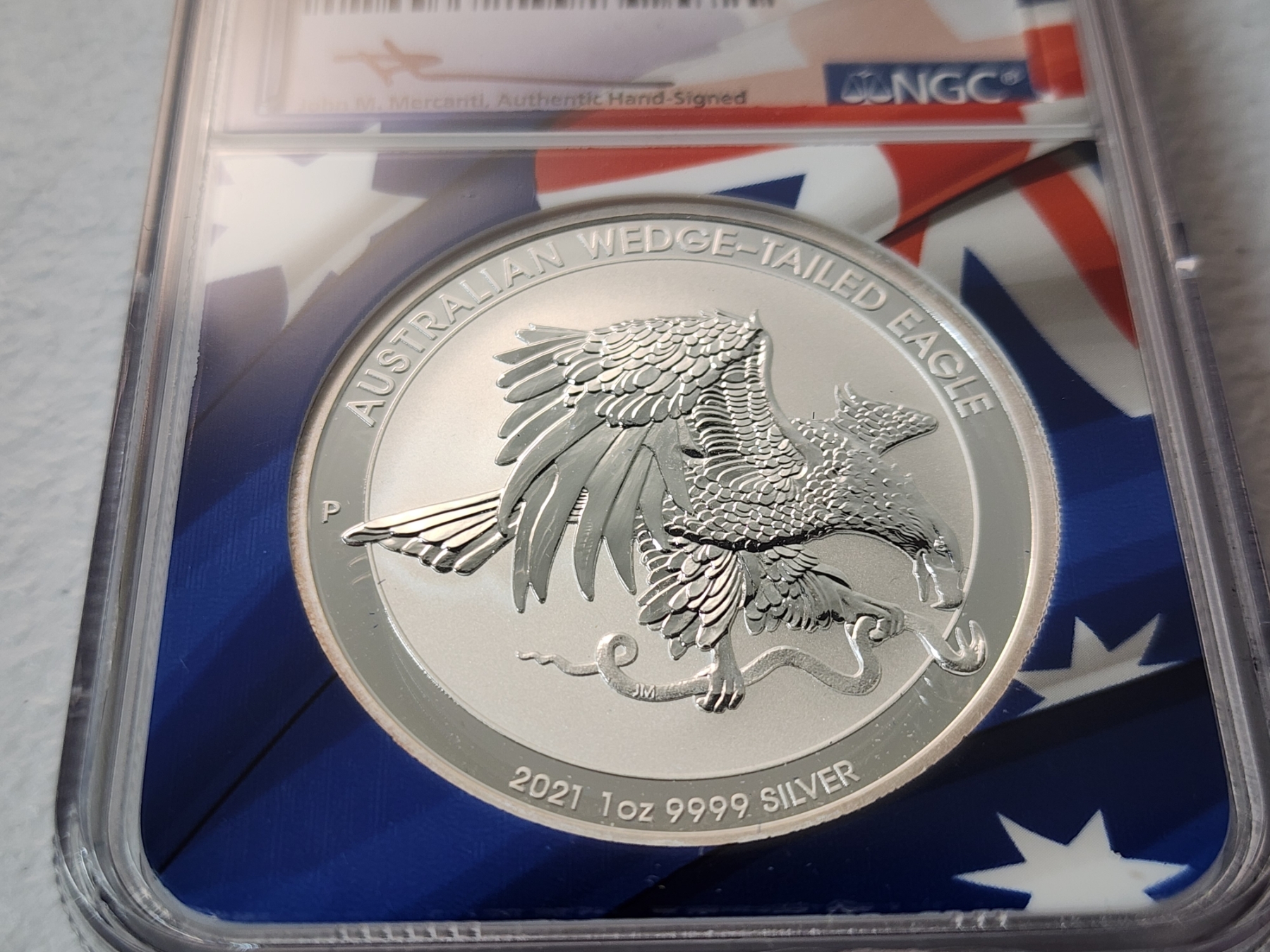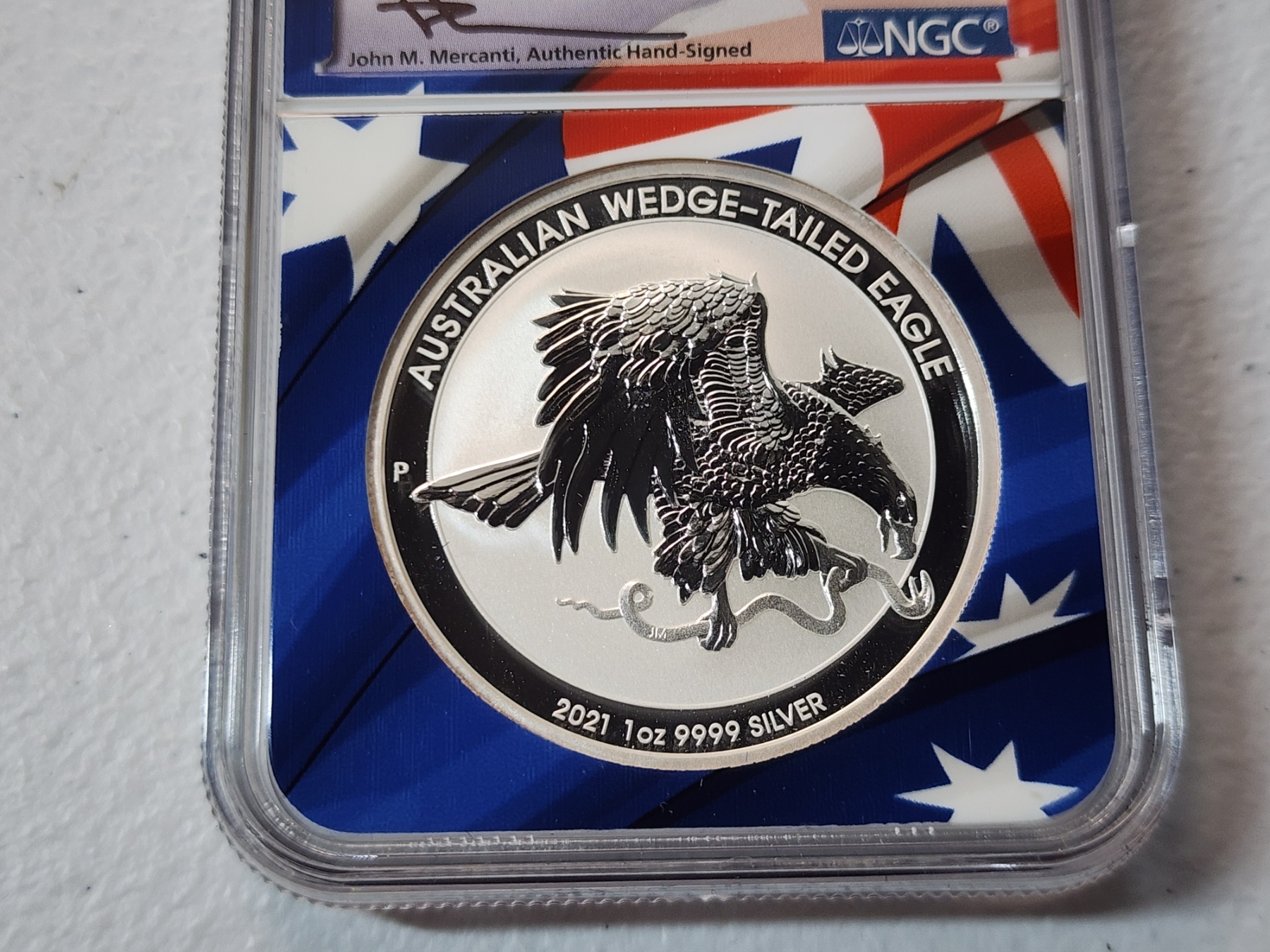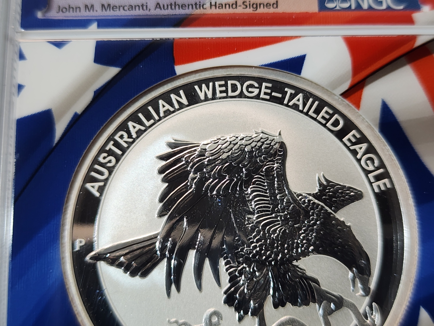 NGC 2021 P Australia .9999 Silver Wedge-Tailed Eagle FDOI MS 70 Signed by Mercanti