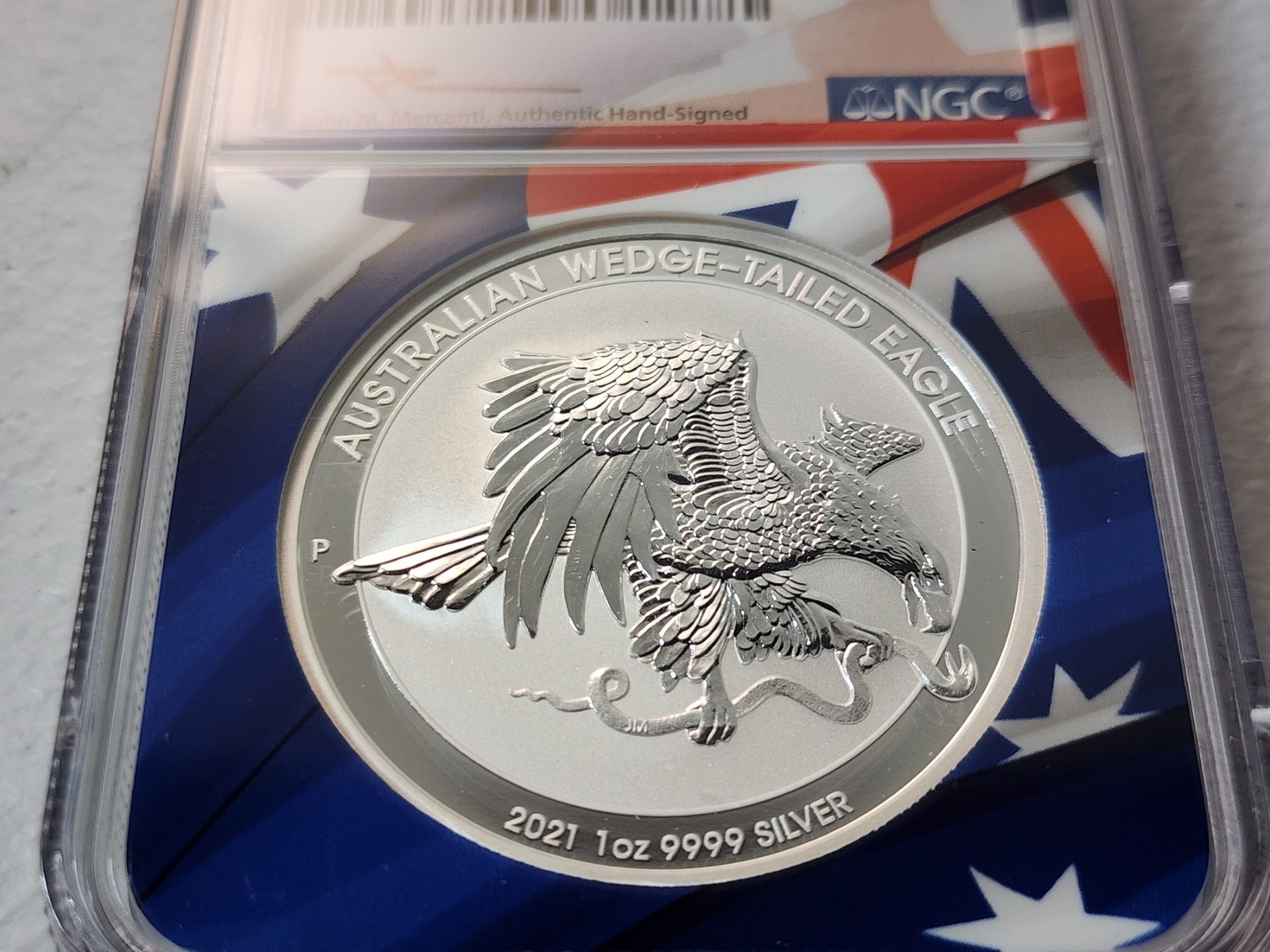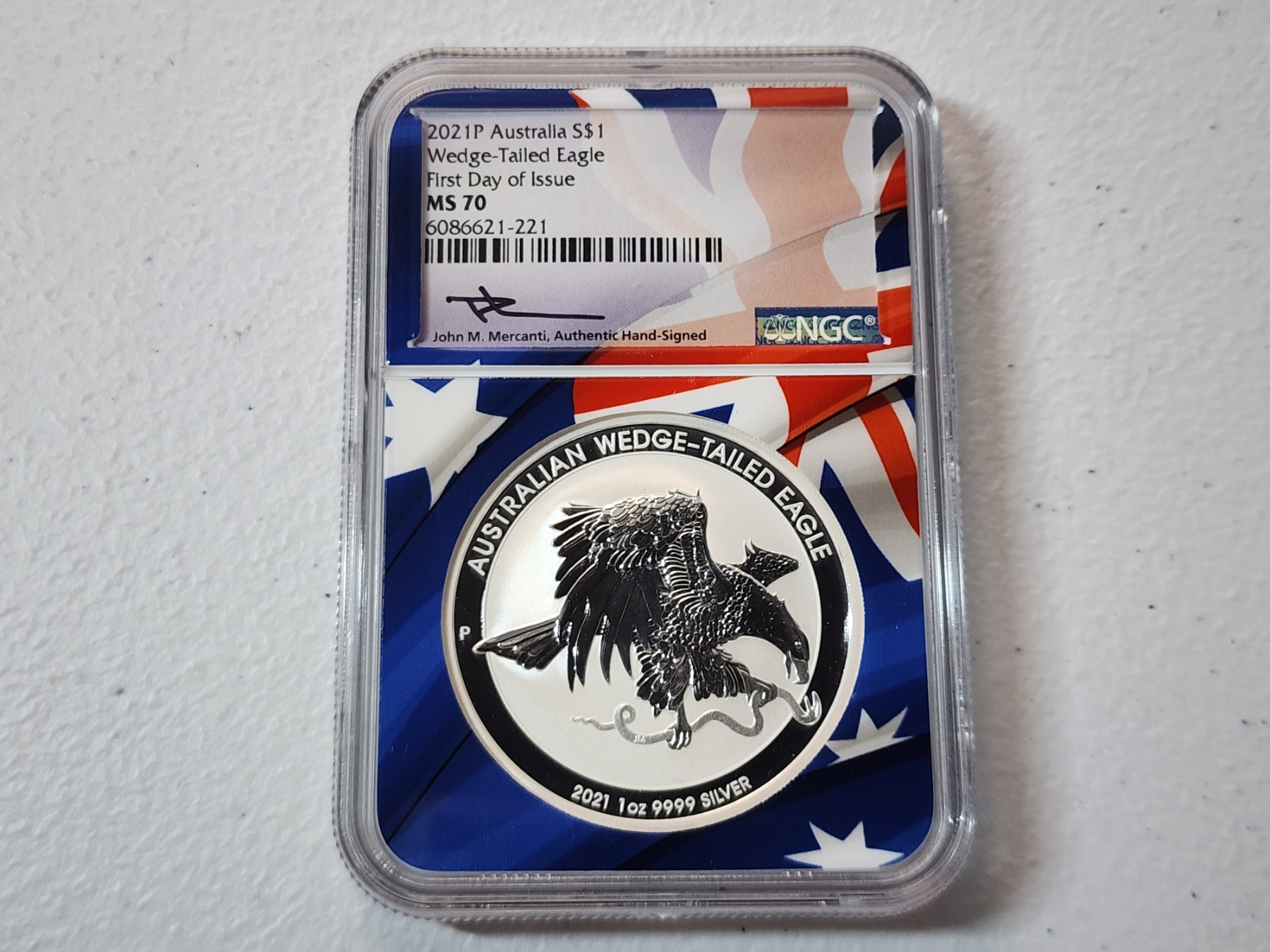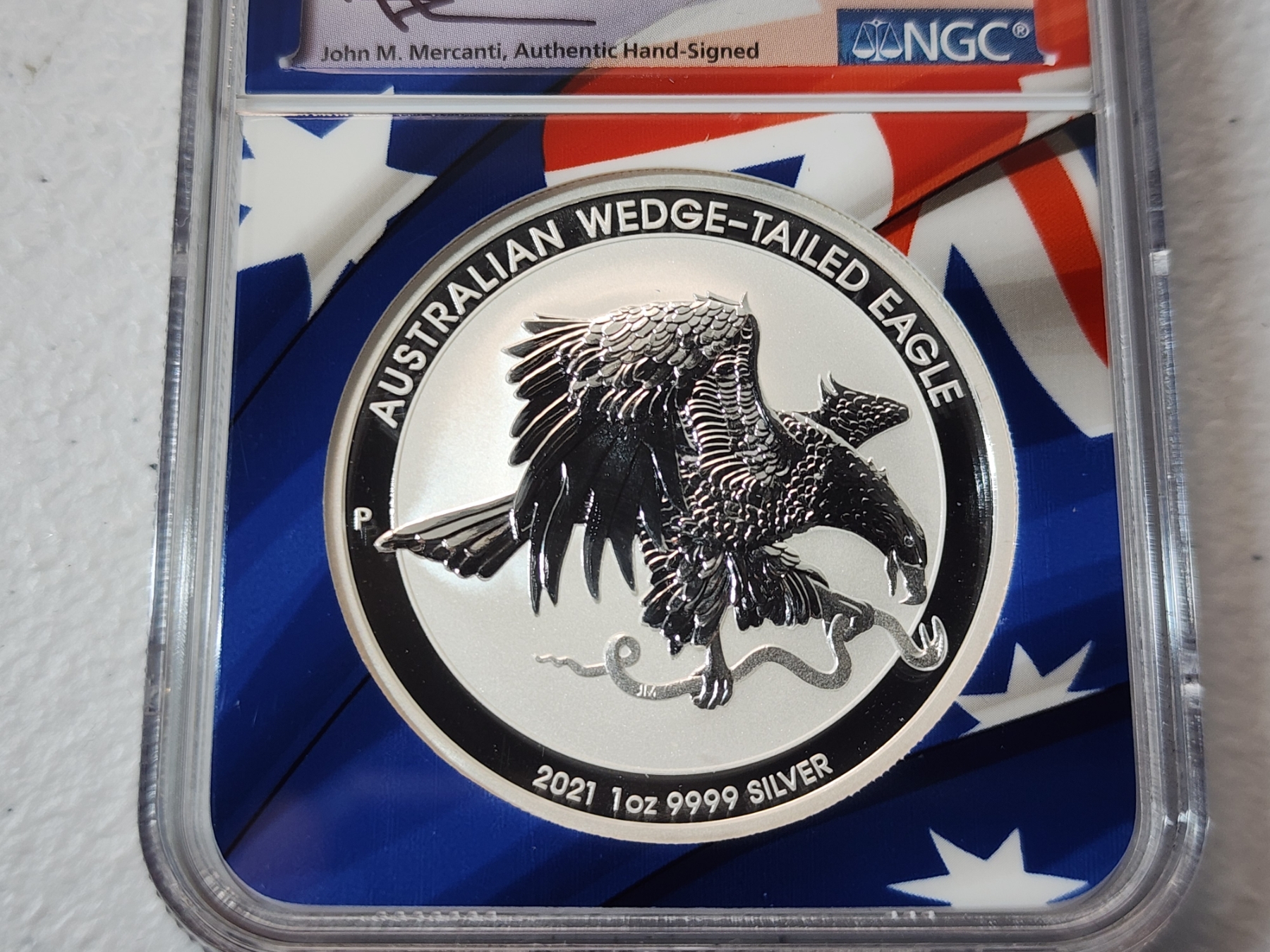 NGC 2021 P Australia .9999 Silver Wedge-Tailed Eagle FDOI MS 70 Signed by Mercanti