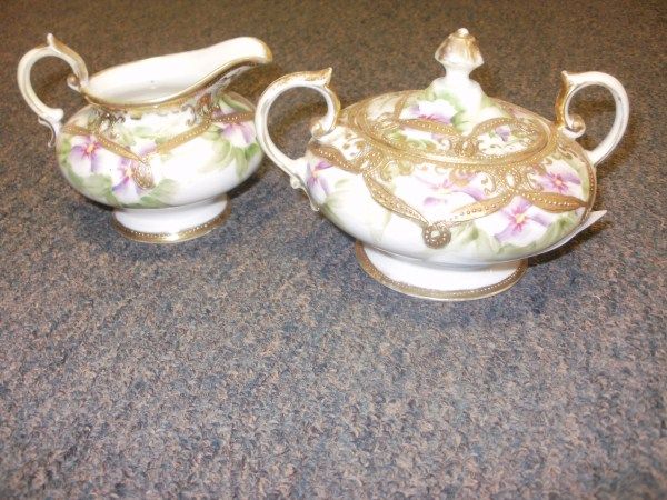NIPPON CREAM AND SUGAR W/PURPLE FLOWERS AND GOLD RIBBON