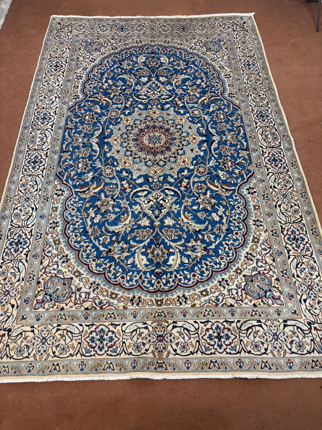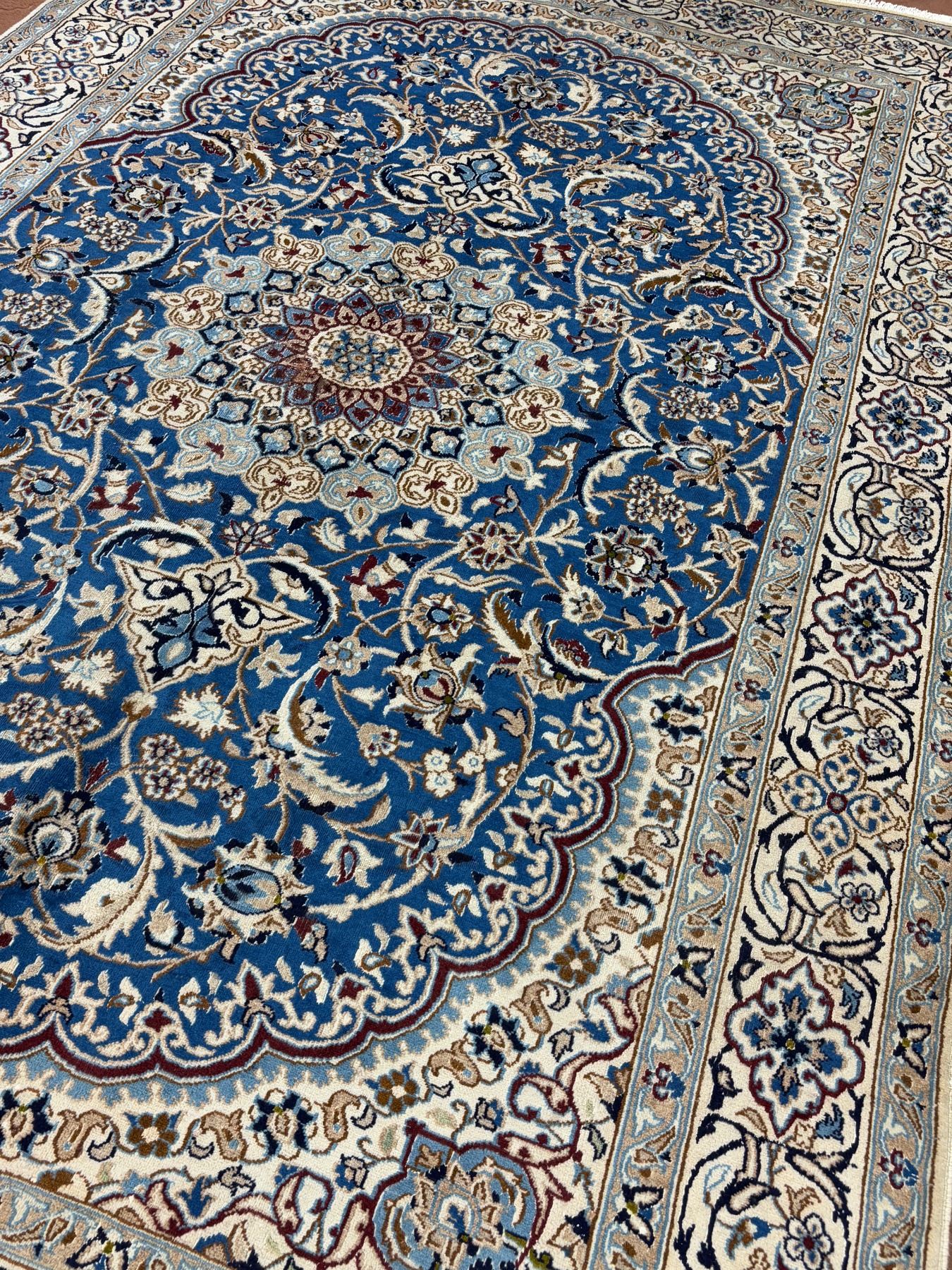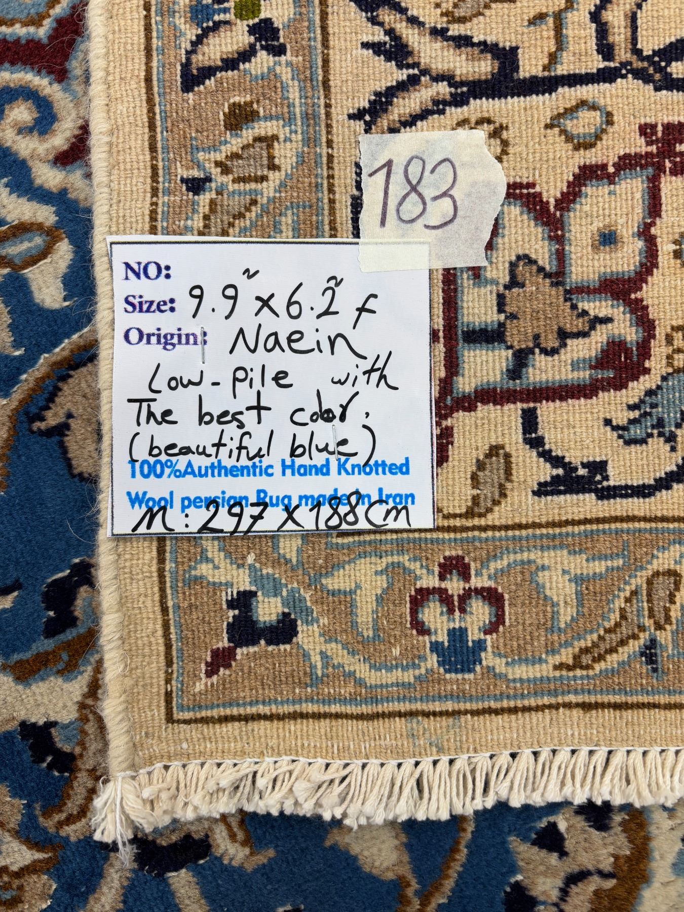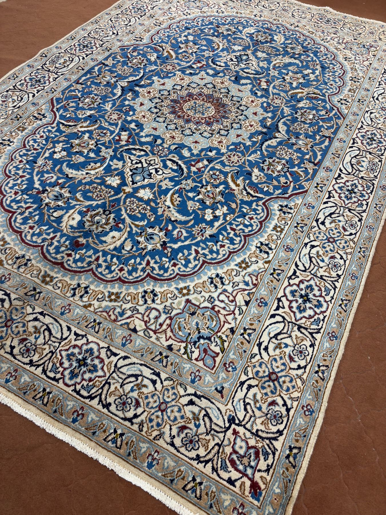 Naein 100% Authentic Hand Knotted Wool Persian Rug Handmade in Iran The best color (beautiful blue) Low pile (These carpets have been washed professionally, and for this reason there are no tears or dirt in this carpet and it will be delivered to you clean and smooth. Don't miss the opportunity to buy such a carpet) Size: 9.9' × 6.2'