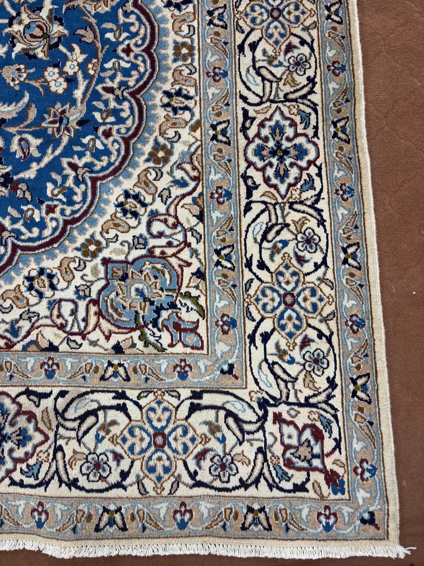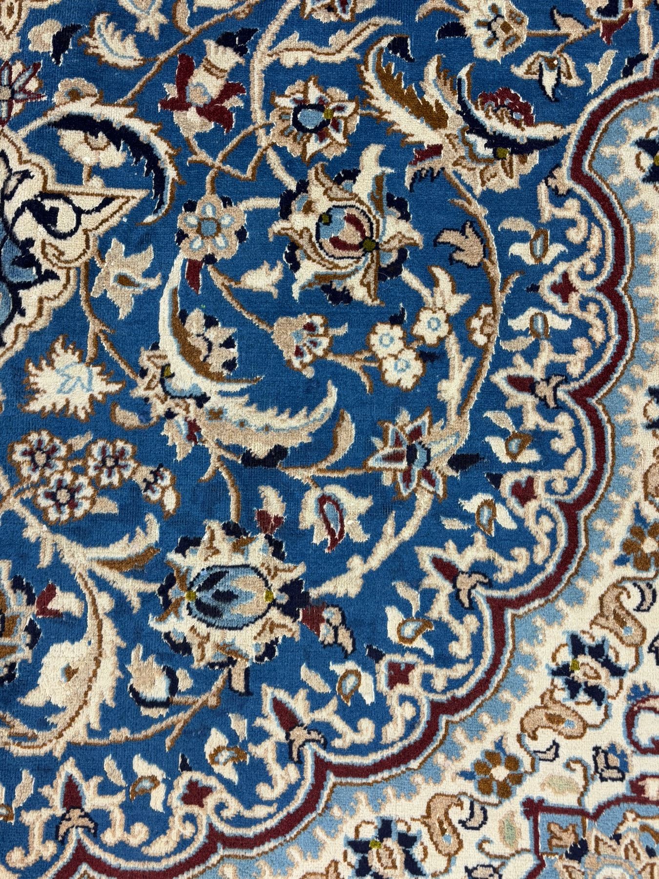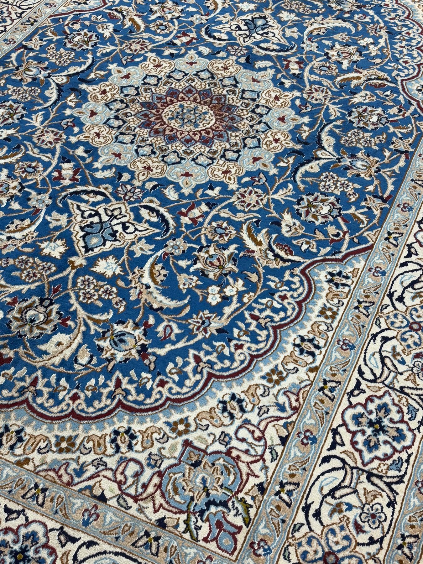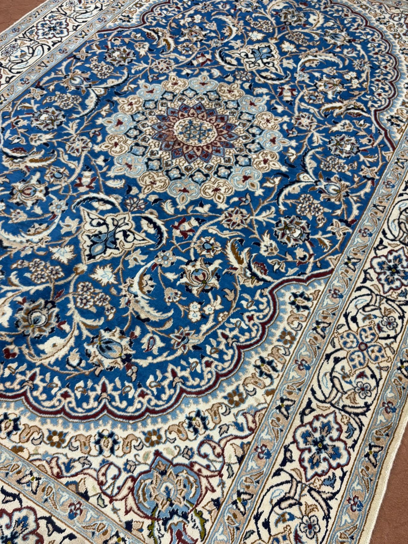 Naein 100% Authentic Hand Knotted Wool Persian Rug Handmade in Iran The best color (beautiful blue) Low pile (These carpets have been washed professionally, and for this reason there are no tears or dirt in this carpet and it will be delivered to you clean and smooth. Don't miss the opportunity to buy such a carpet) Size: 9.9' × 6.2'