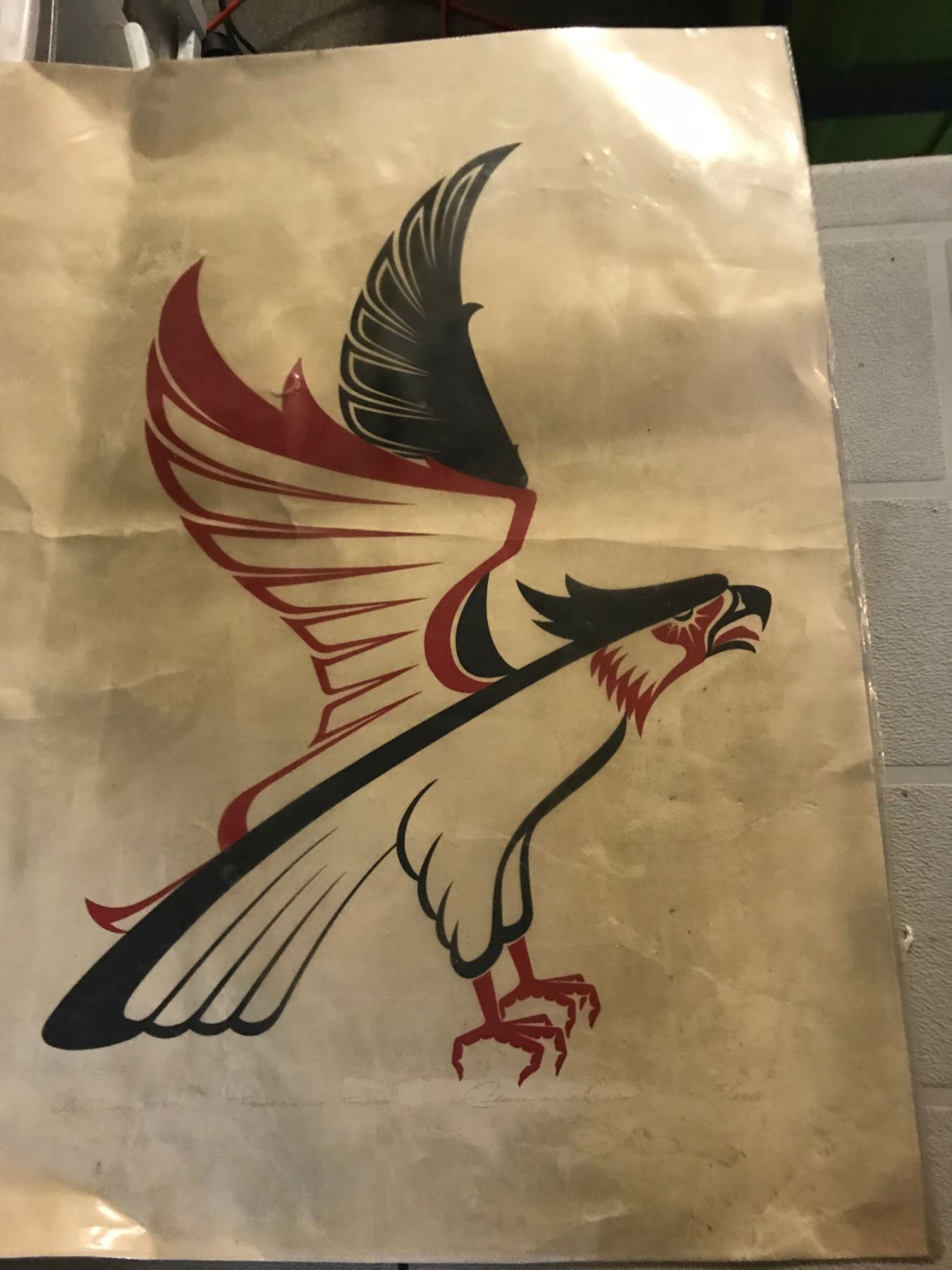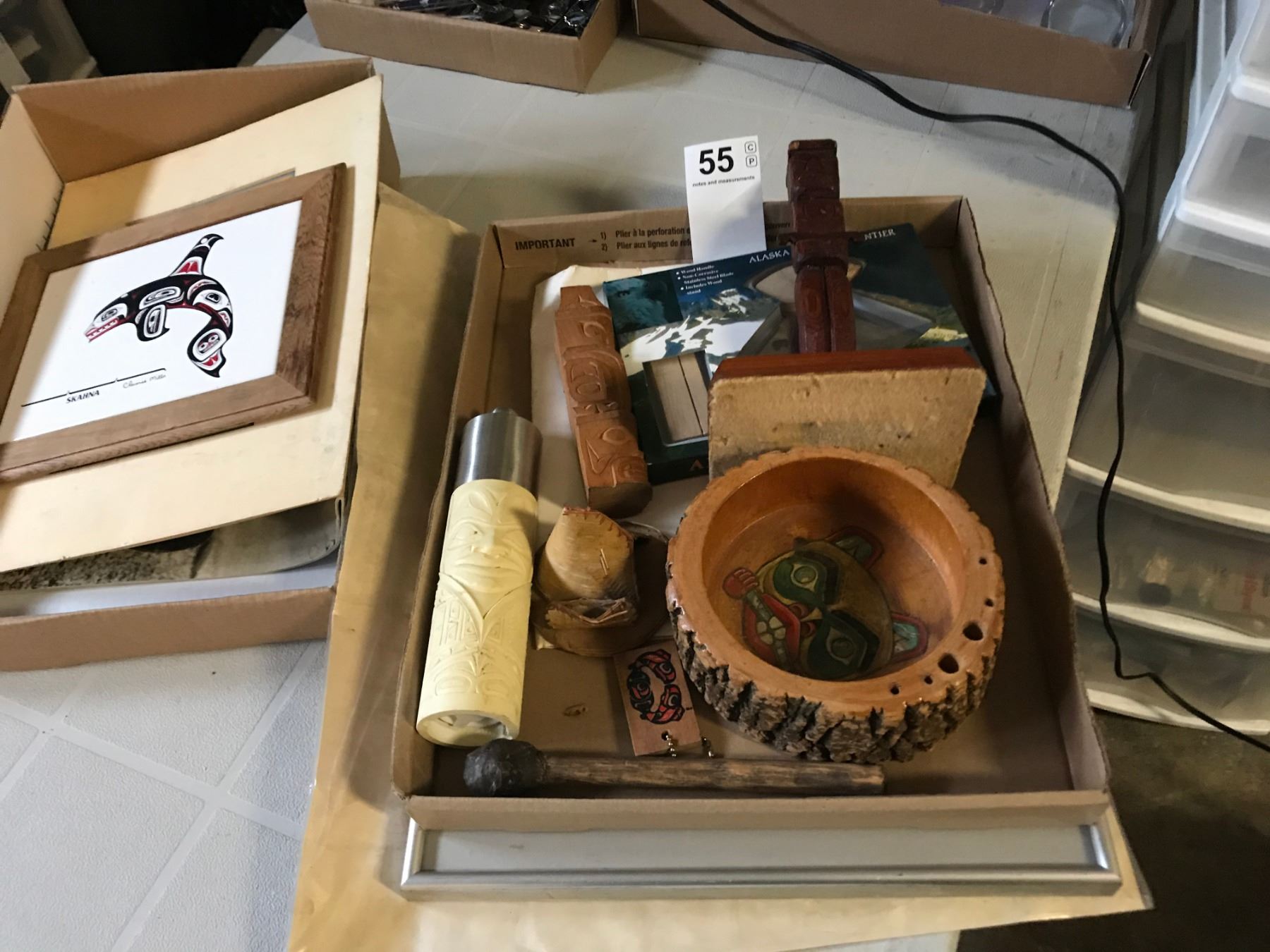 Totam Pole Carving by Will Stevenson, Paper birch teepee and Canoe about 3 inches, Framed Prayer for Stein by V. David. Eagle numbered 5/195 by Clarence . And more. Pickup at 10am