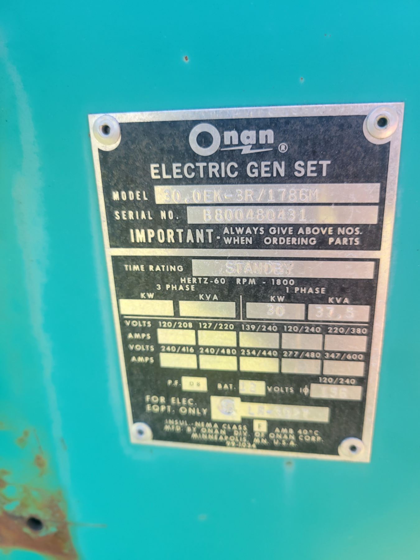 Natural gas/ Propane Onan Gen Set, 30/EK c/w Ford 6 cyl.