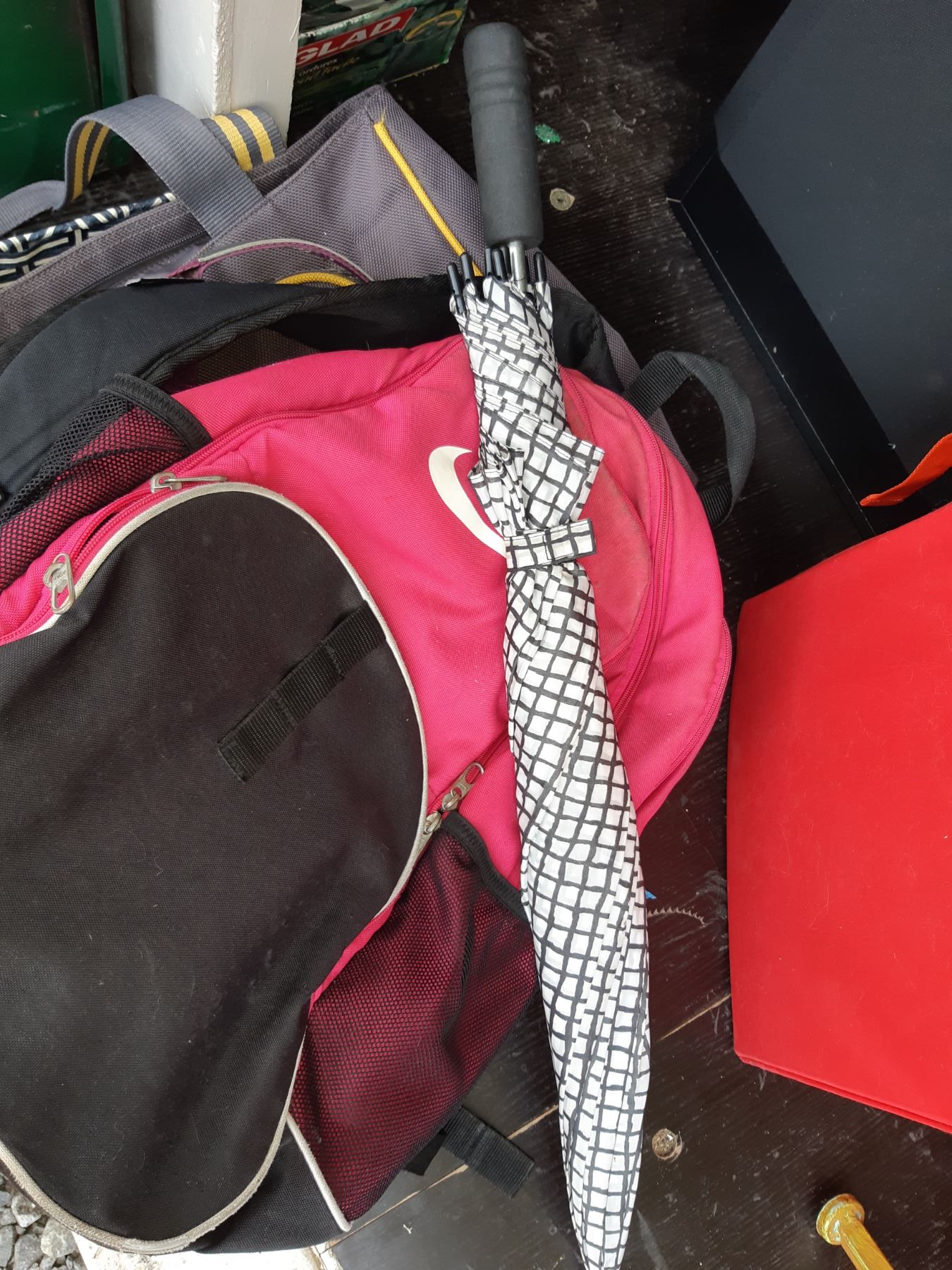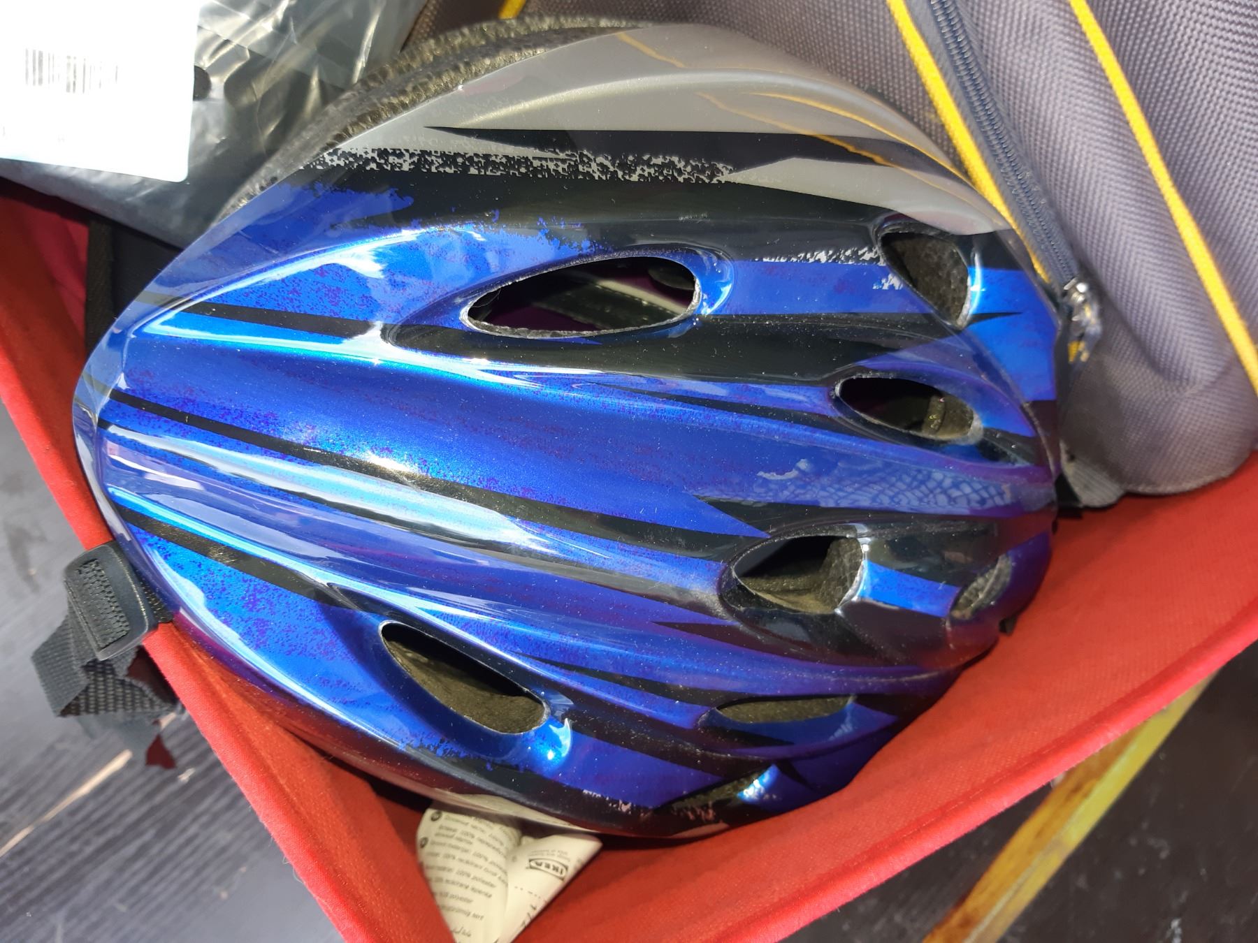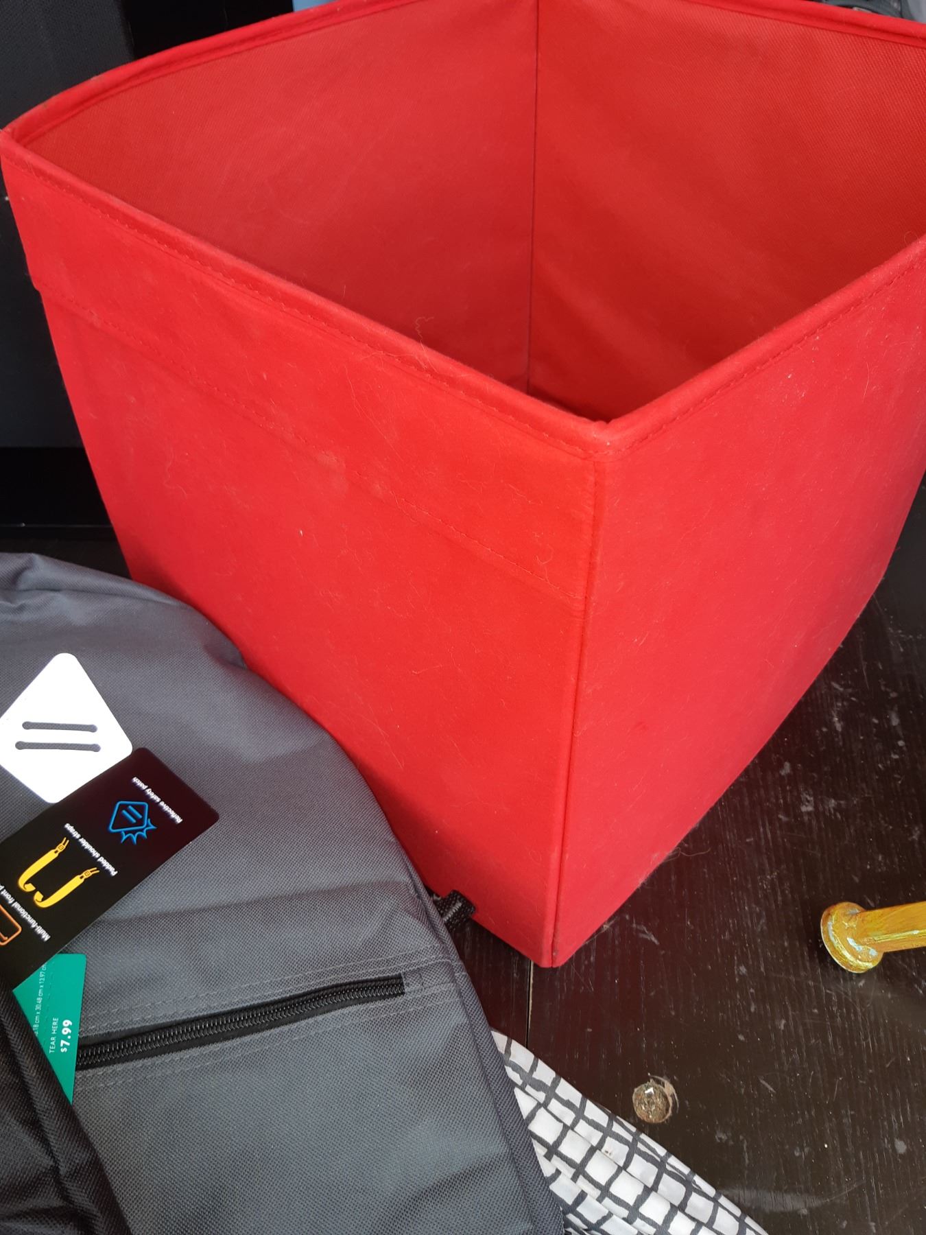 Red canvas box with new & used backpacks, bike helmet, bicycle, padded over shorts for extra seat comfort size L. Scarf holders. Pickup at 10 am