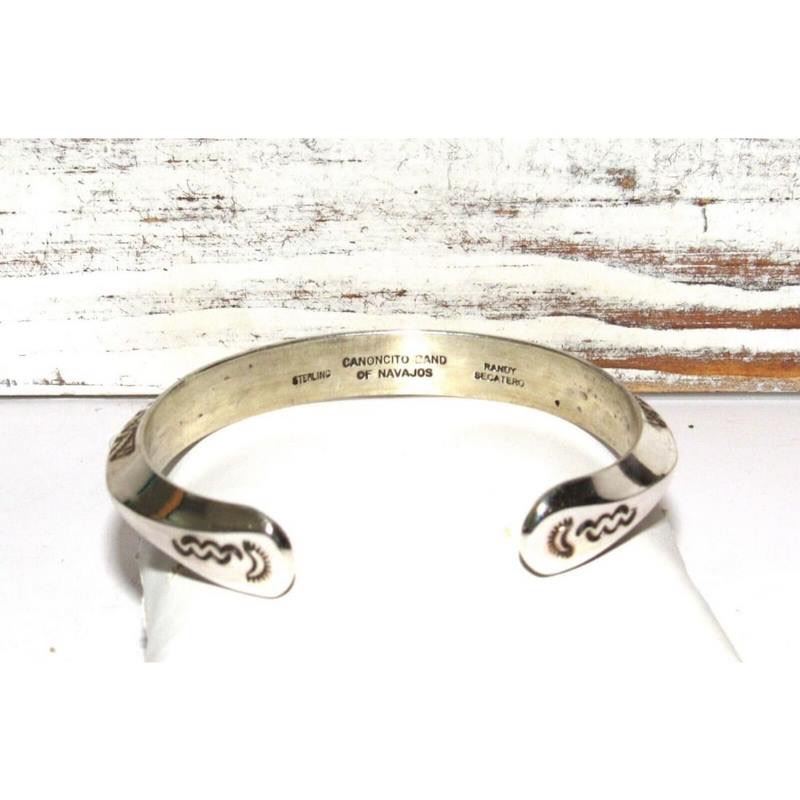 Phenomenal, substantial gauge sterling silver Native American Navajo intricately hand stamped, double sided cuff bracelet by the Navajo artist Randy Secatero. Exceptional craftsmanship and attention to detail, intricately hand stamped tribal design. Features mesas of the southwest and tribal symbols on each side. The inside circumference is 6 1/4" including the gap. The measurement from end to end of silver is 5" plus the gap is 1 1/4". The cuff weighs about 48g. Stamped sterling, signed by the artist. Exceptional example of wearable Native American art to add to any jewelry collection. FREE SHIPPING ON ALL JEWELRY ORDERS WITHIN THE US!