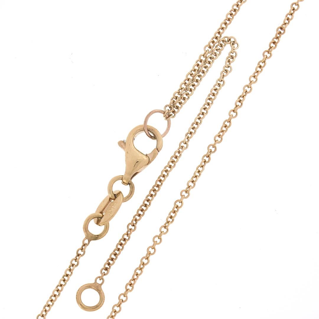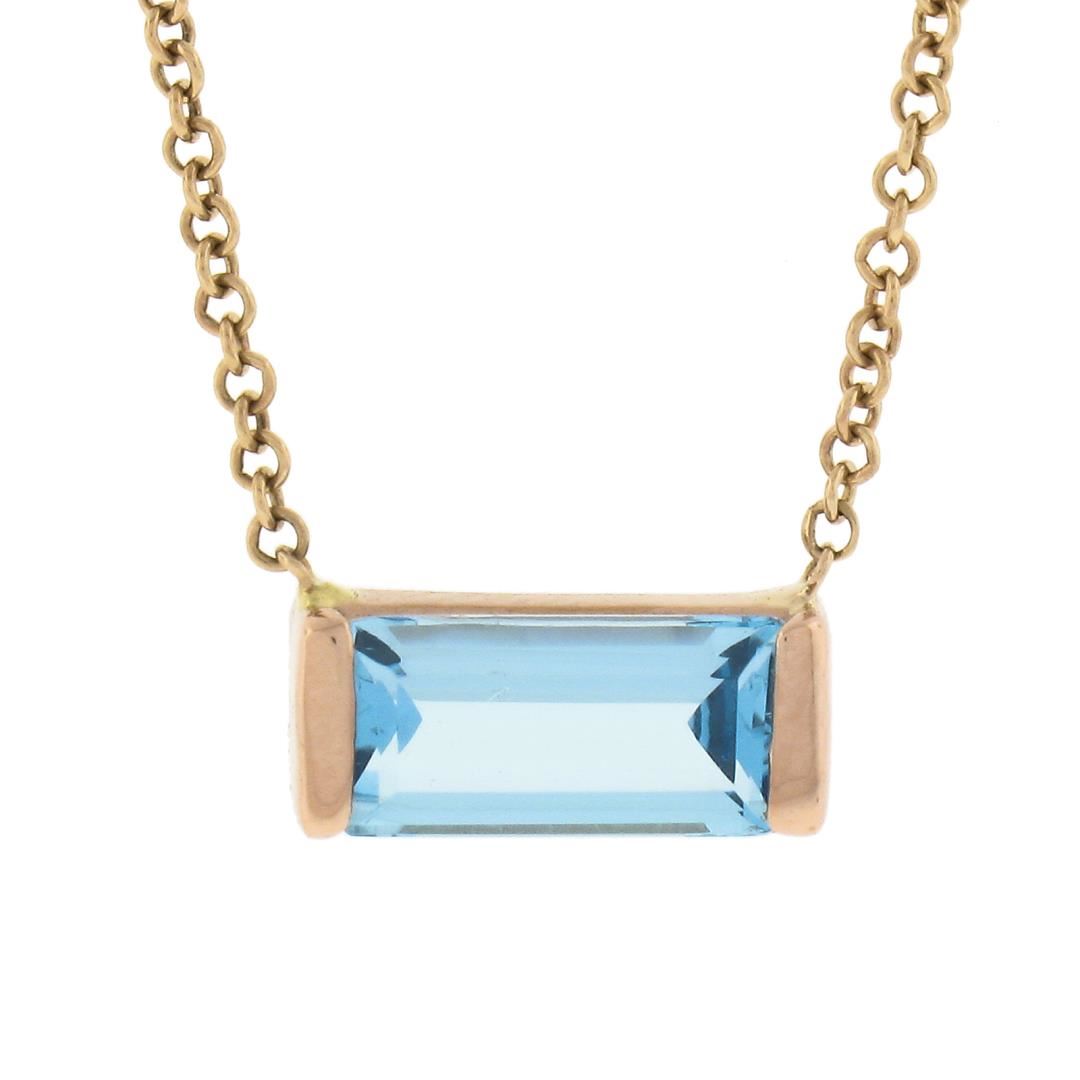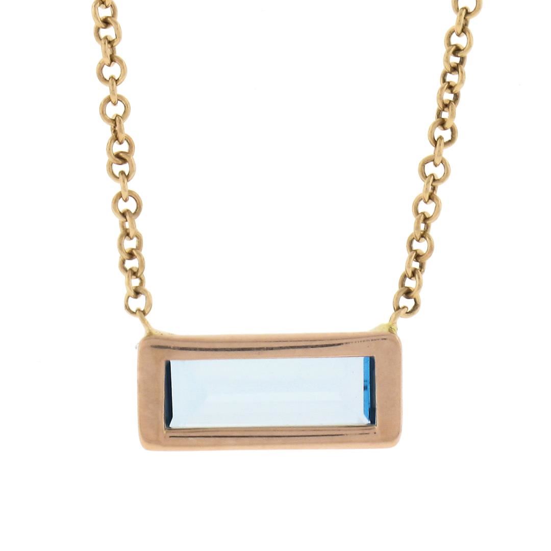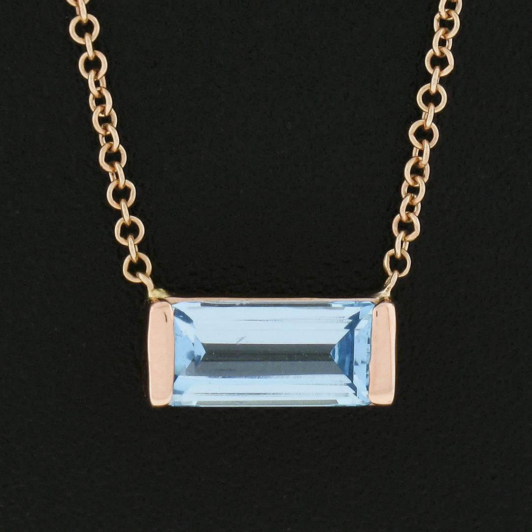 A new solid 14k rose gold pendant necklace, with 1 emerald cut natural blue topaz (0.78ct). Adjustable 16 or 18 inch cable link chain, 2.19 grams total weight, pendant measures 4.1x9.5mm.