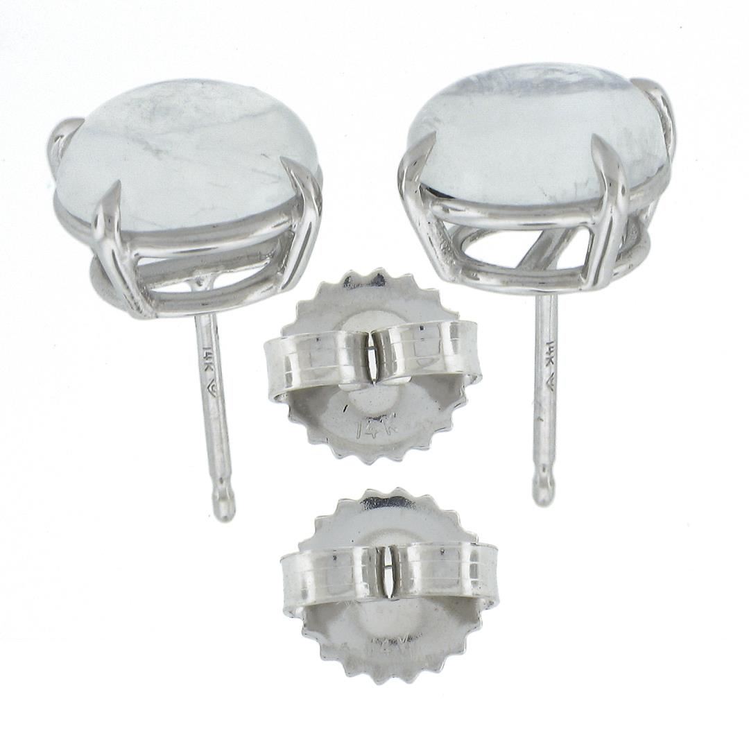 A new solid 14k white gold stud earrings, with 2 round cabochon cut natural moonstones (8.7mm). The earrings measure approximately 10.1mm and weigh a total of 2.34 grams.