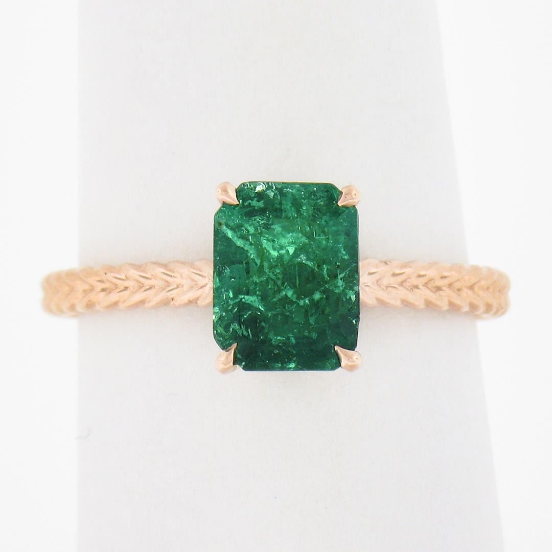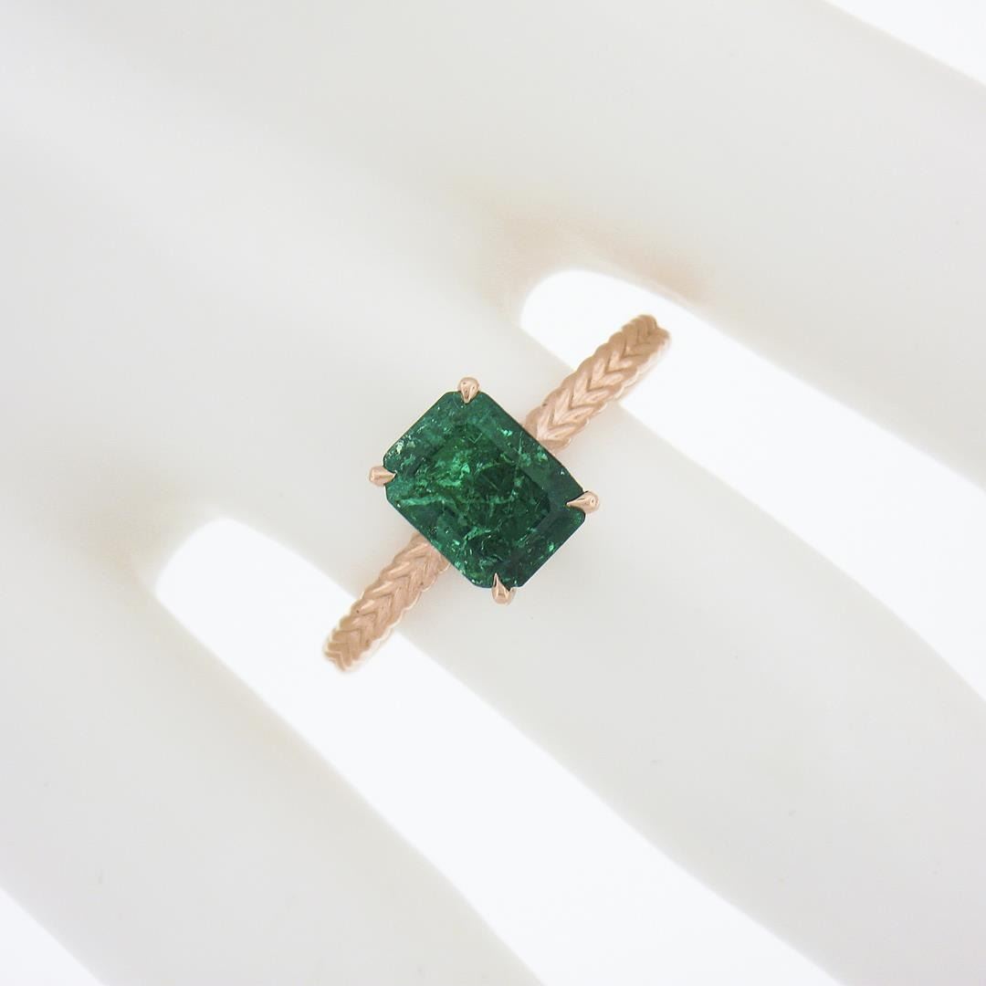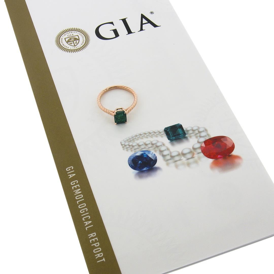 A new solid 14k rose gold solitaire ring, with 1 GIA graded octagonal cut natural emerald ( 1.43ct ). The ring is size 6.5, weighs a total of 2.56 grams, and measures 7.9mm wide. Comes with all original relevant certifications.