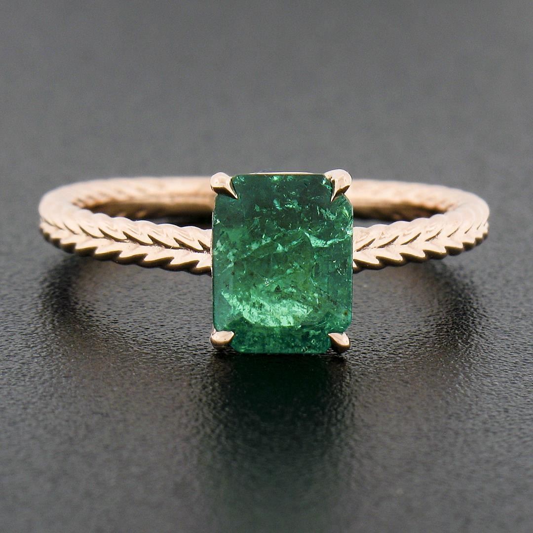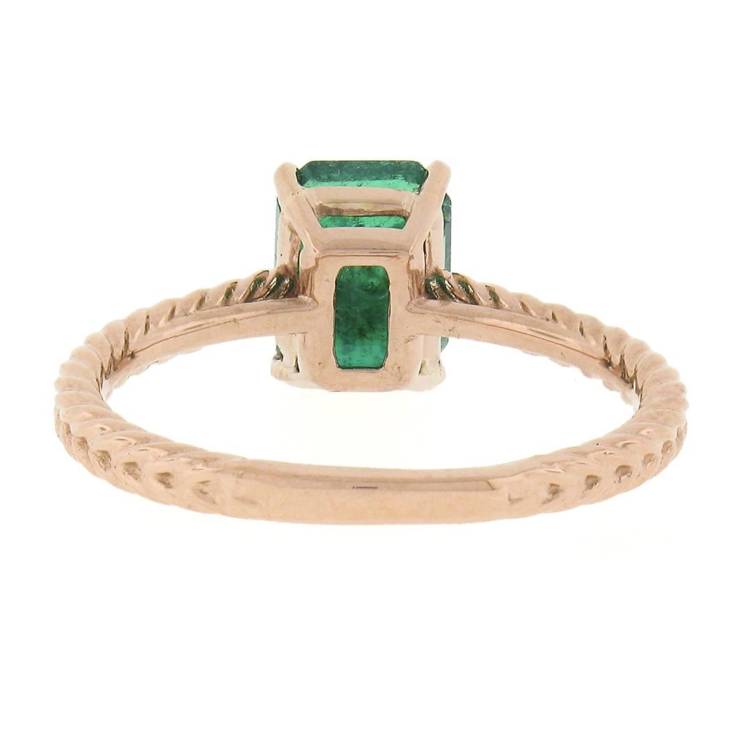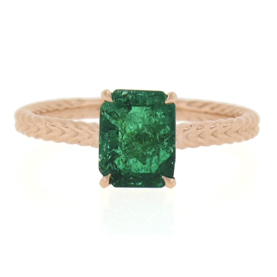 A new solid 14k rose gold solitaire ring, with 1 GIA graded octagonal cut natural emerald ( 1.43ct ). The ring is size 6.5, weighs a total of 2.56 grams, and measures 7.9mm wide. Comes with all original relevant certifications.