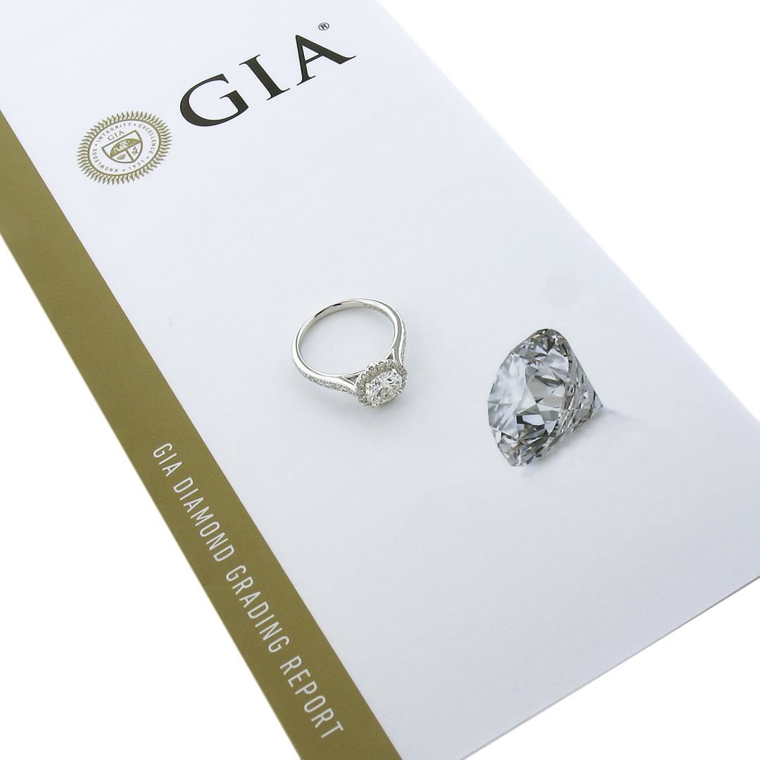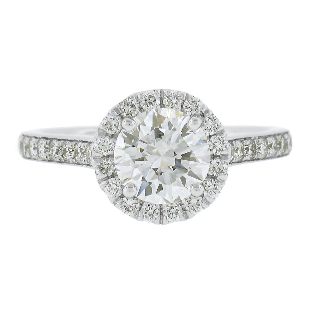 A new solid 14k white gold engagement ring, featuring 1 GIA round cut natrual diamond (F - SI1 ; 1.11ct ), with a halo of round cut natural diamonds (F/G - VS1/VS2 ; 0.48ctw). The ring is size 6.5, weighs a total of 3.20 grams, and measures 9.6mm wide. Comes with all original relevant certifications.