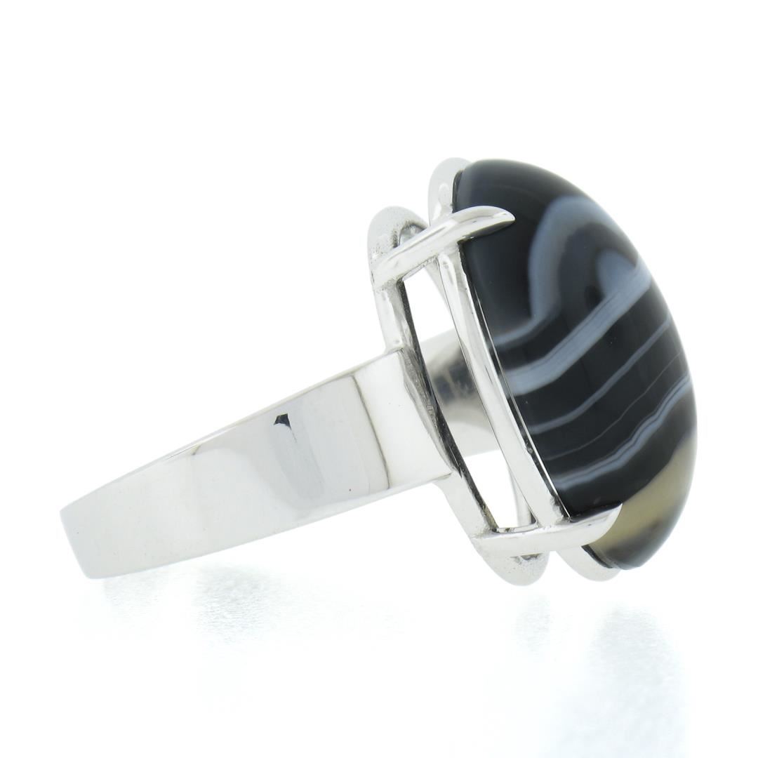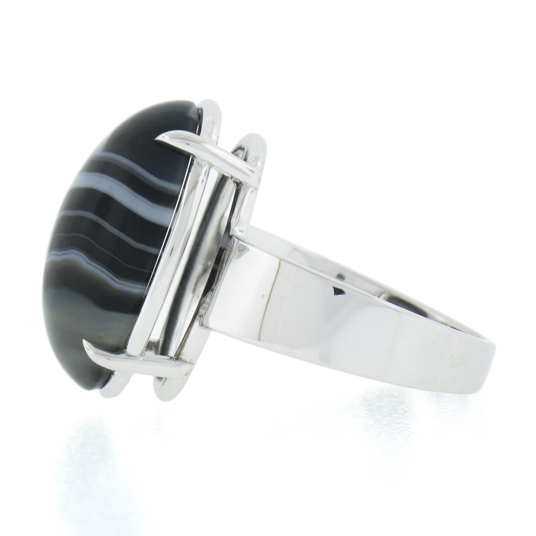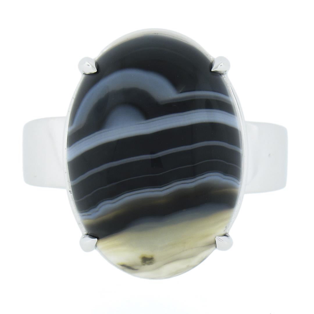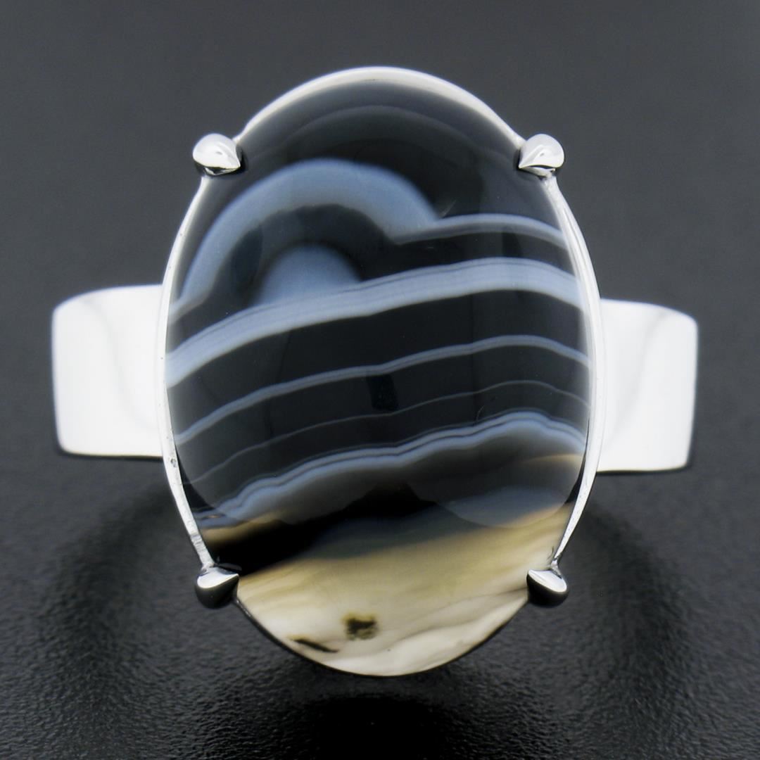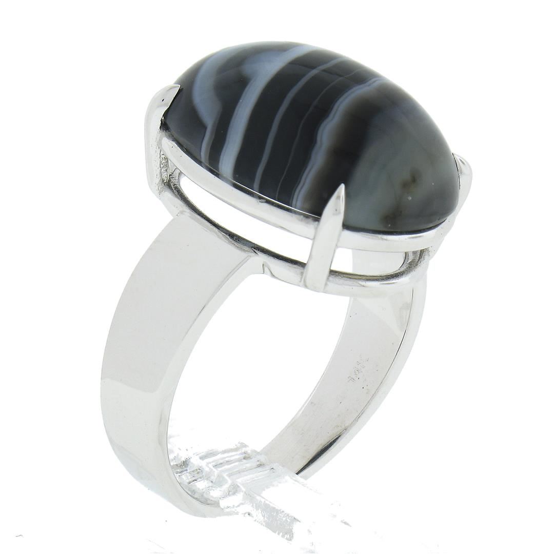 A new solid 14k white gold ring, with 1 oval cabochon cut natural agate (18.2x13mm). The ring is size 8.0, weighs a total of 6.81 grams, and measures 18.8mm wide.