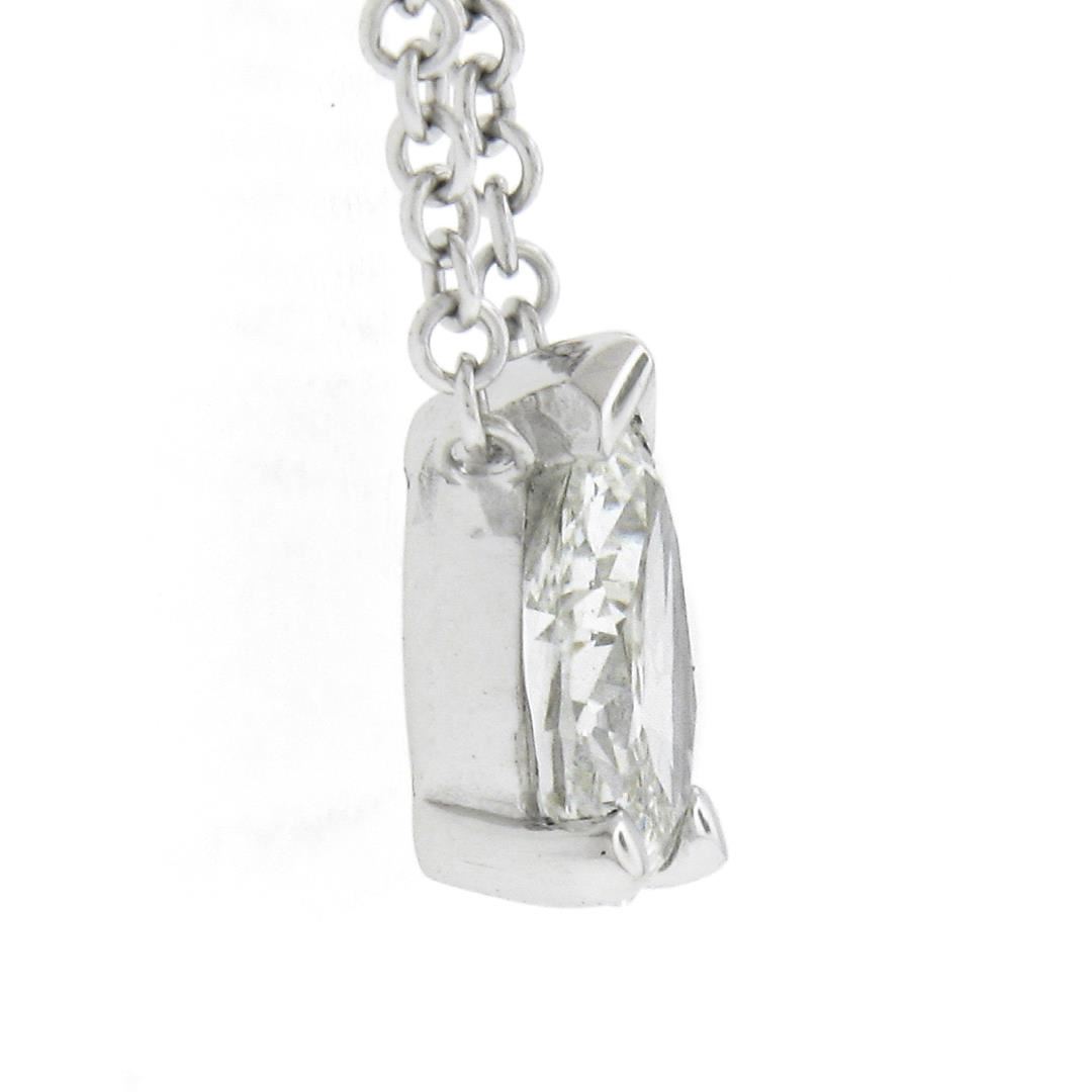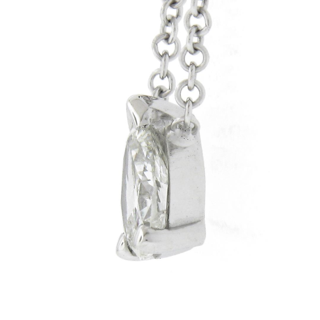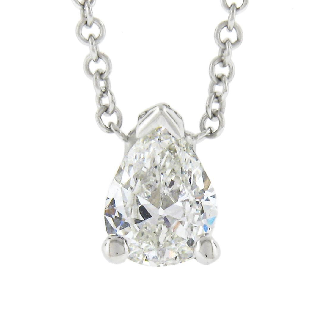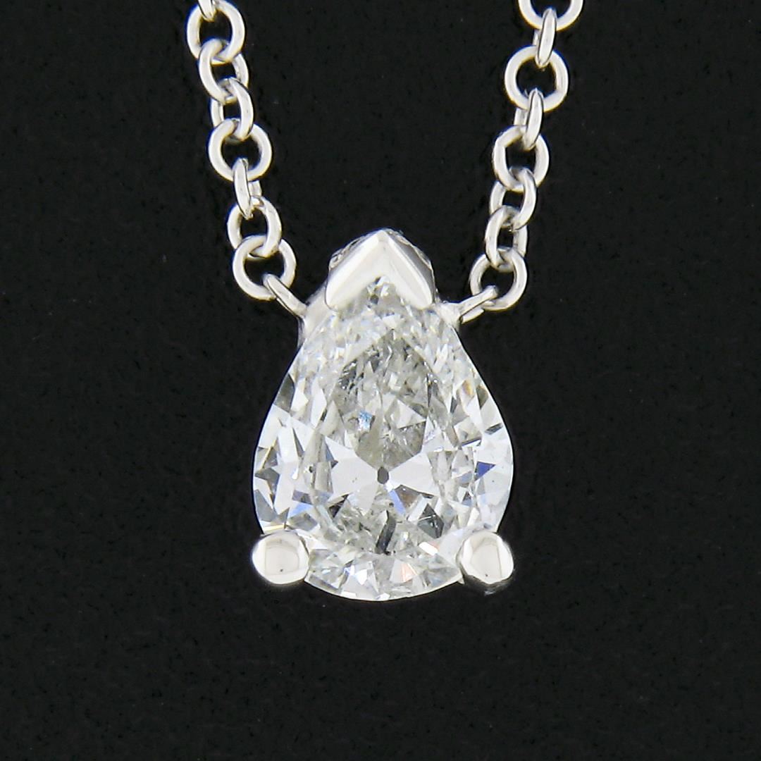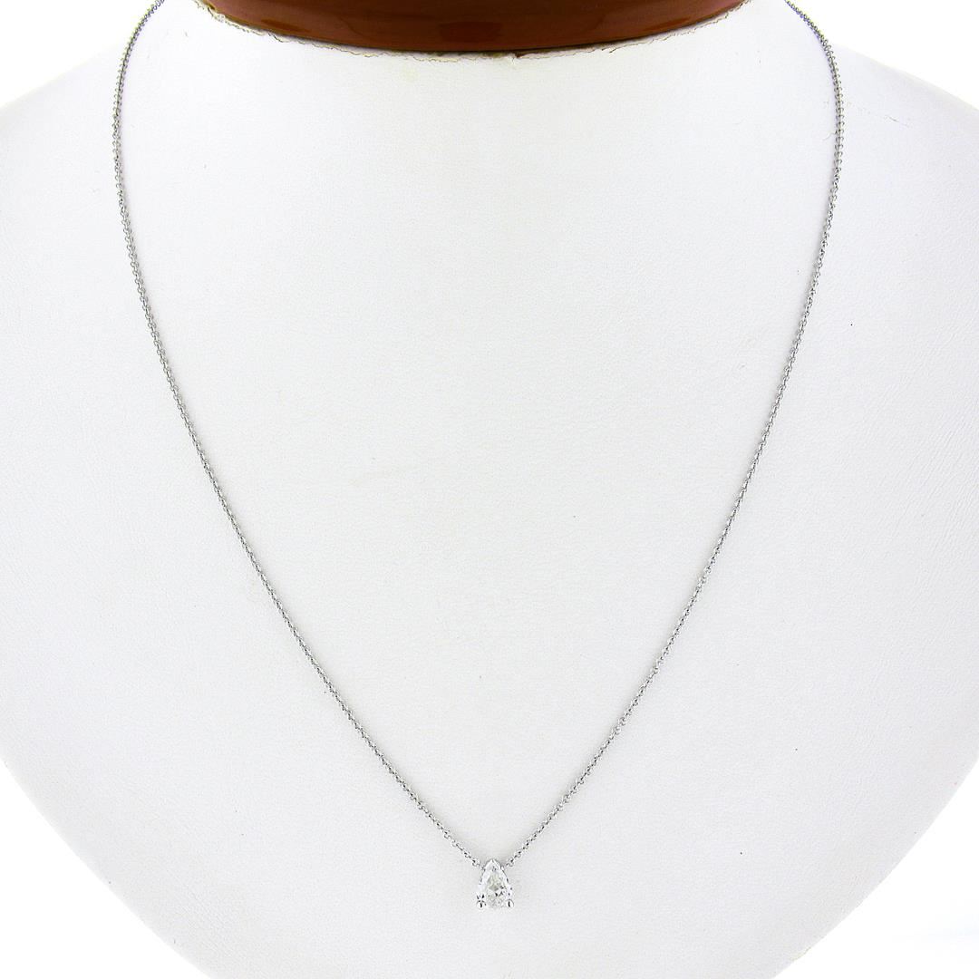 A new solid 14k white gold pendant necklace, with 1 pear cut natural diamond (I - SI1; 0.34ct). Adjustable 16 or 18 inch cable link chain, 1.86 grams total weight, pendant measures 6.35x4.6mm.