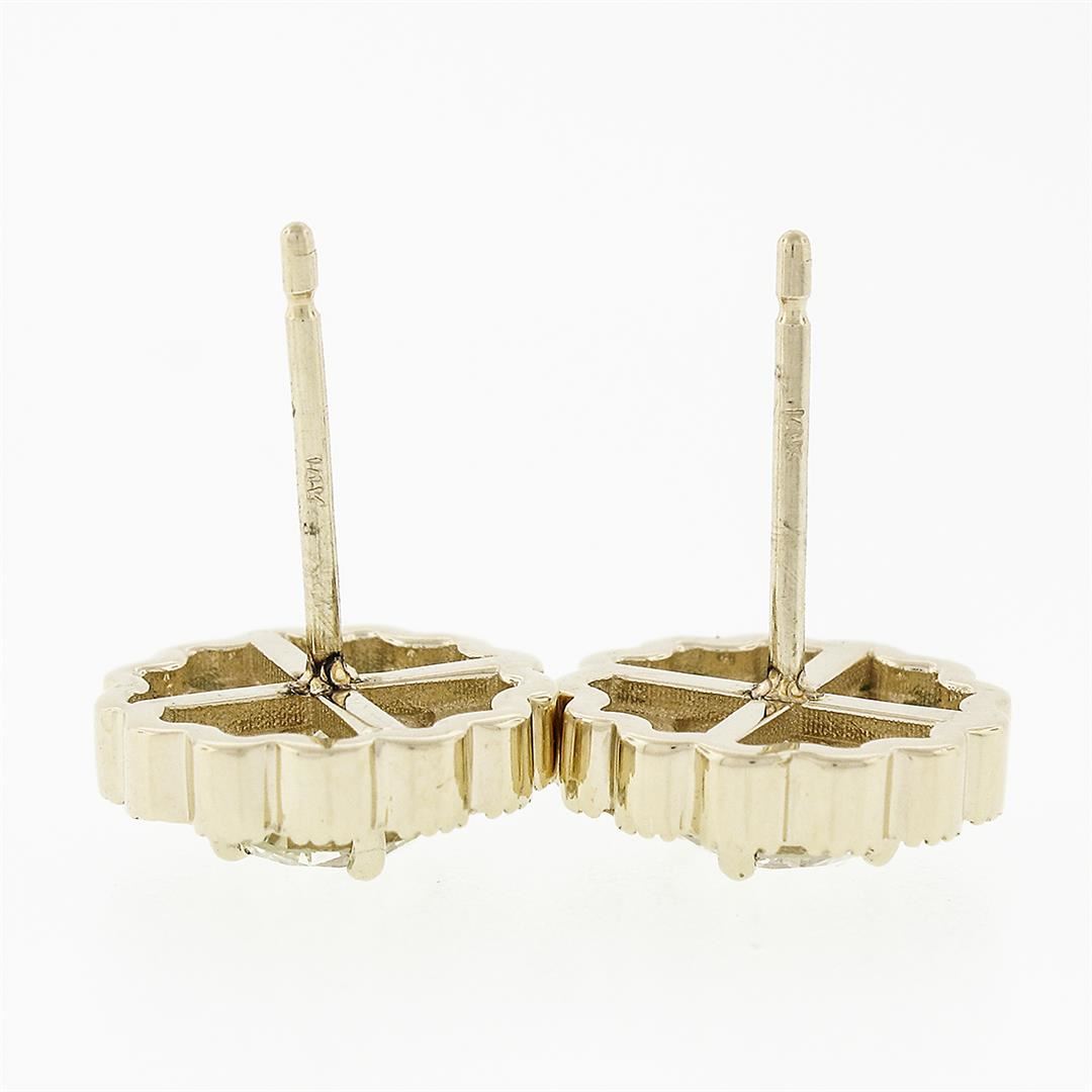 A new solid 14k yellow gold pair of flower cluster earrings, with 26 round brilliant cut natural emeralds (0.52ctw), and 2 round brilliant cut natural diamonds (H/I - VS1/VS2 ; 0.81ctw). The earrings measure approximately 10.7mm in diameter and weigh a total of 3.94 grams.